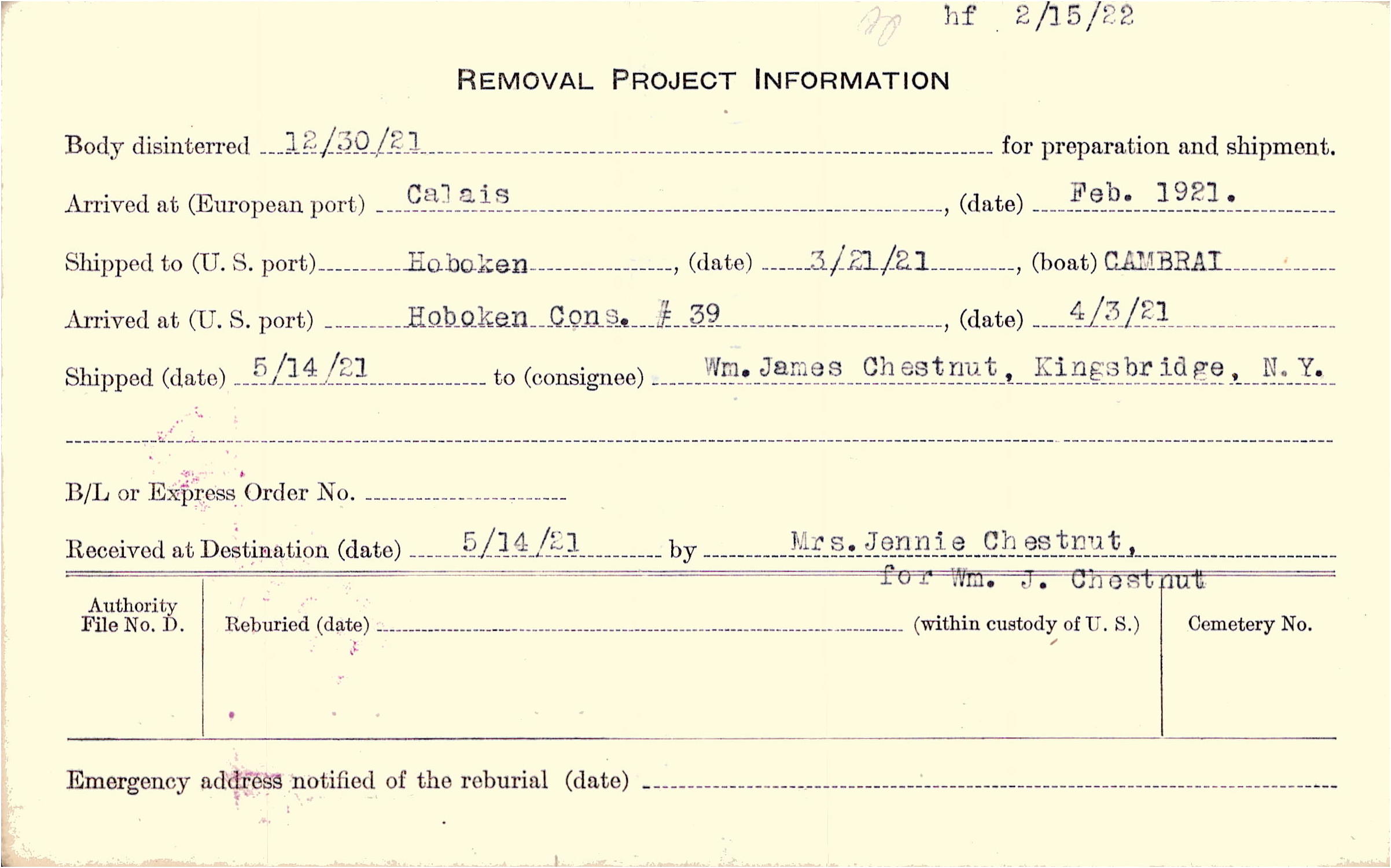 Body disinterred 12/30/1921 for preparation and shipment.