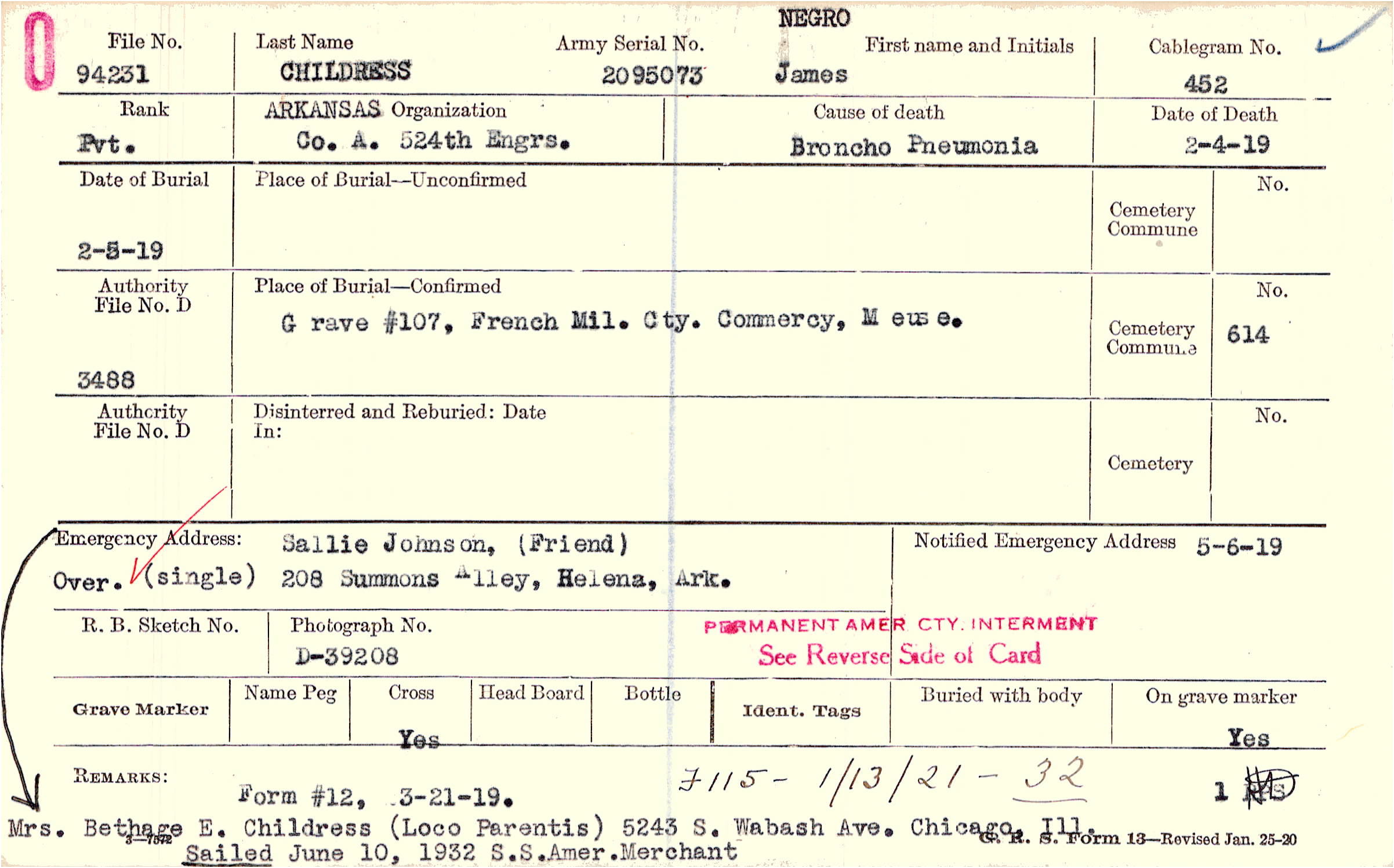 Mrs. Bethage E. Childress (Loco Parentis) 5243 S. Wabash Ave. Chicago, Ill. Sailed June 10, 1932 S. S. Amer. Merchant., Form #12 3-21-19, F115 1/13/21 - 32