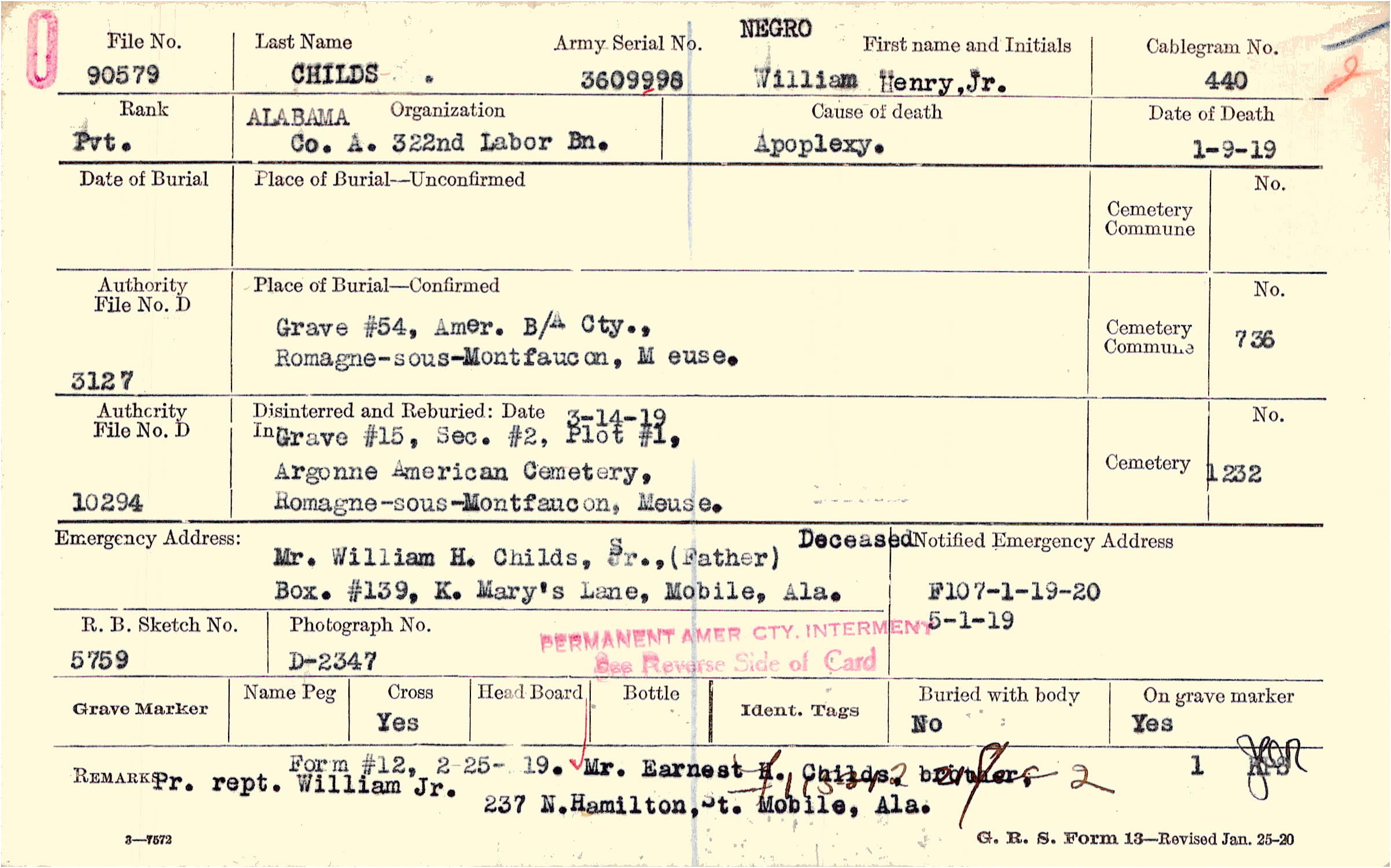 Mr. William H. Childs, Sr., (Father), Box. #139, K. Mary's Lane, Mobile, Ala., Deceased