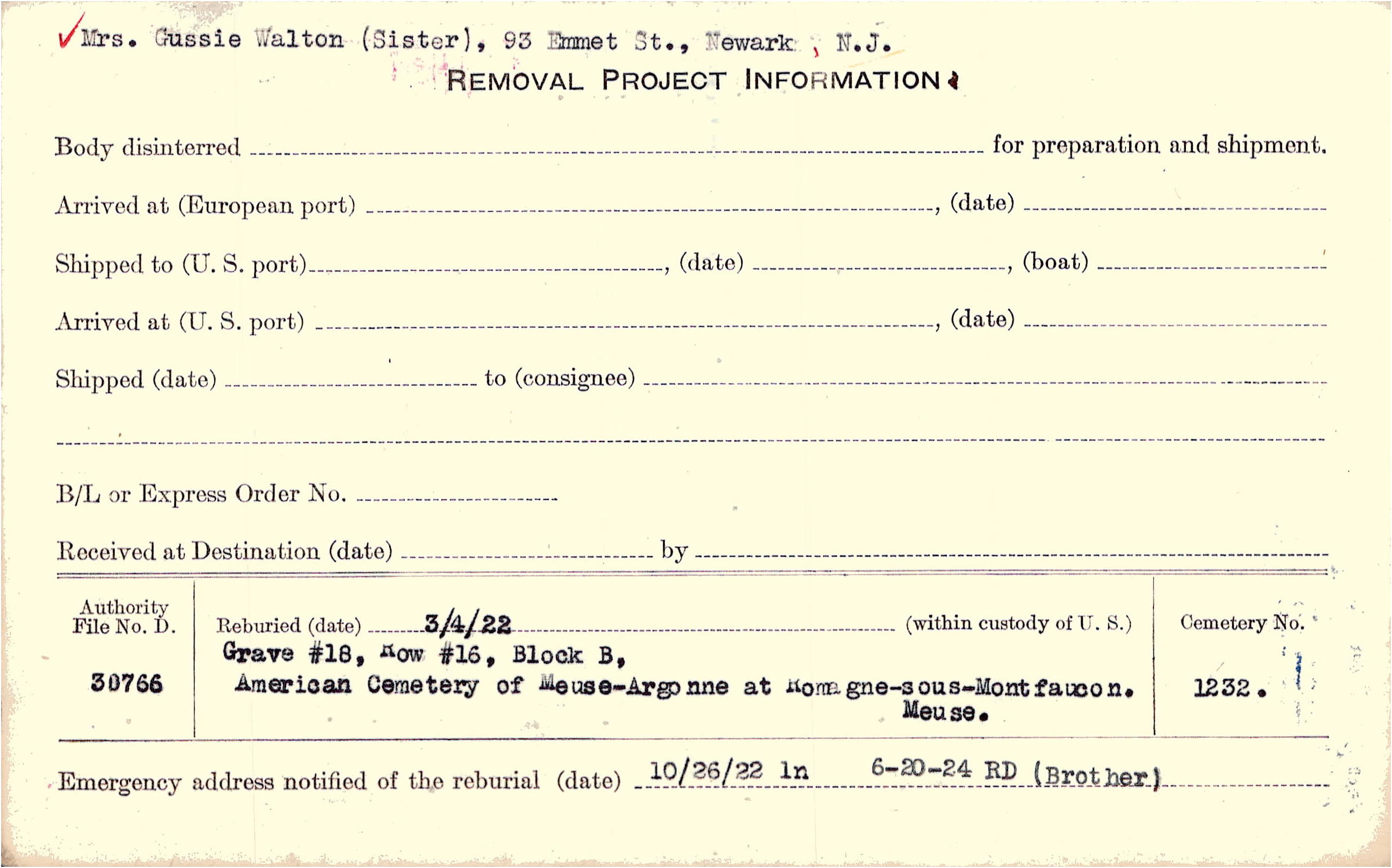 Mrs. Gussie Walton (Sister), 93 Emmet St., Newark, N.J. 6-20-24 (Brother) |