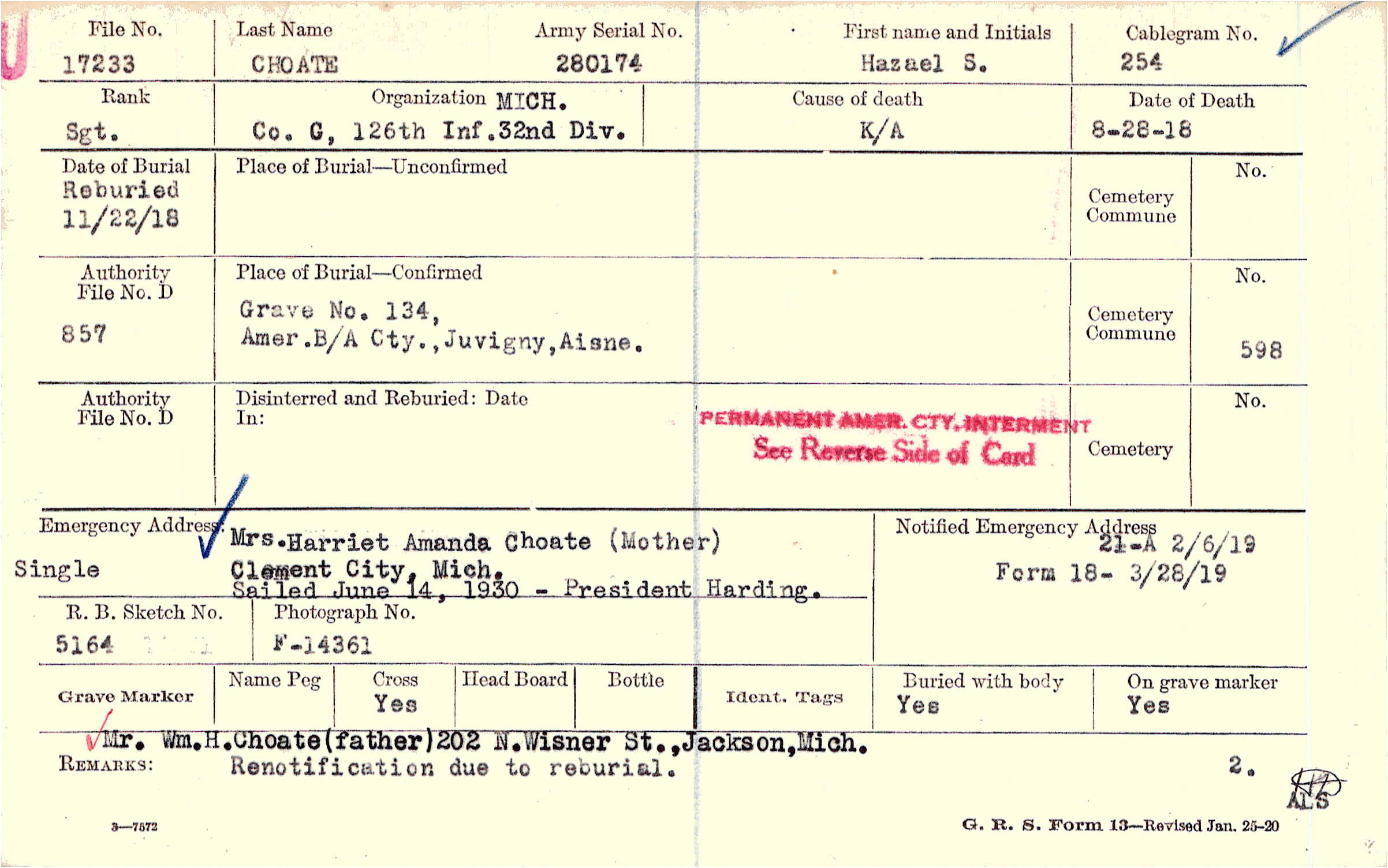 Mr. Wm.H.Choate (father) 202 N.Wisner St., Jackson, Mich. Renotification due to reburial.