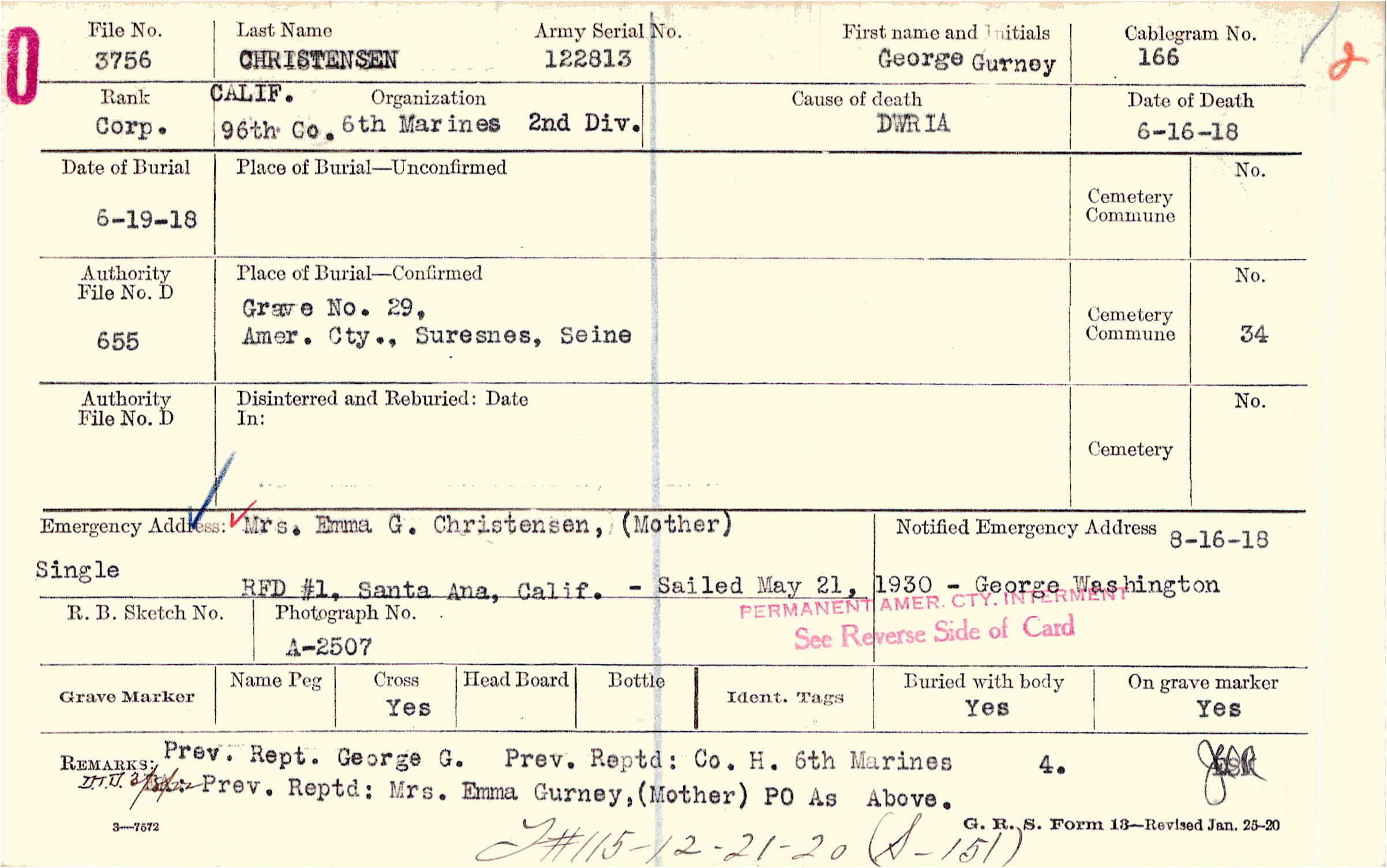 Prev. Rept. George G. Prev. Reptd: Co. H. 6th Marines Prev. Reptd: Mrs. Emma Gurney, (Mother), PO As Above, F#115-12-21-20 (S-151)