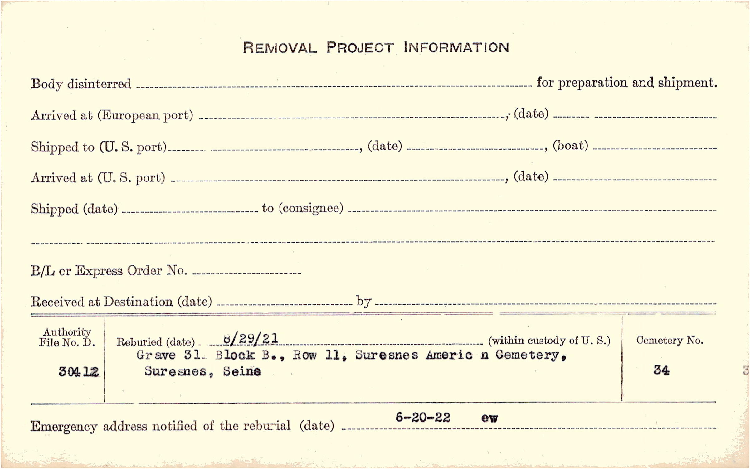 | Permanent Burial in Foreign Cemetery |