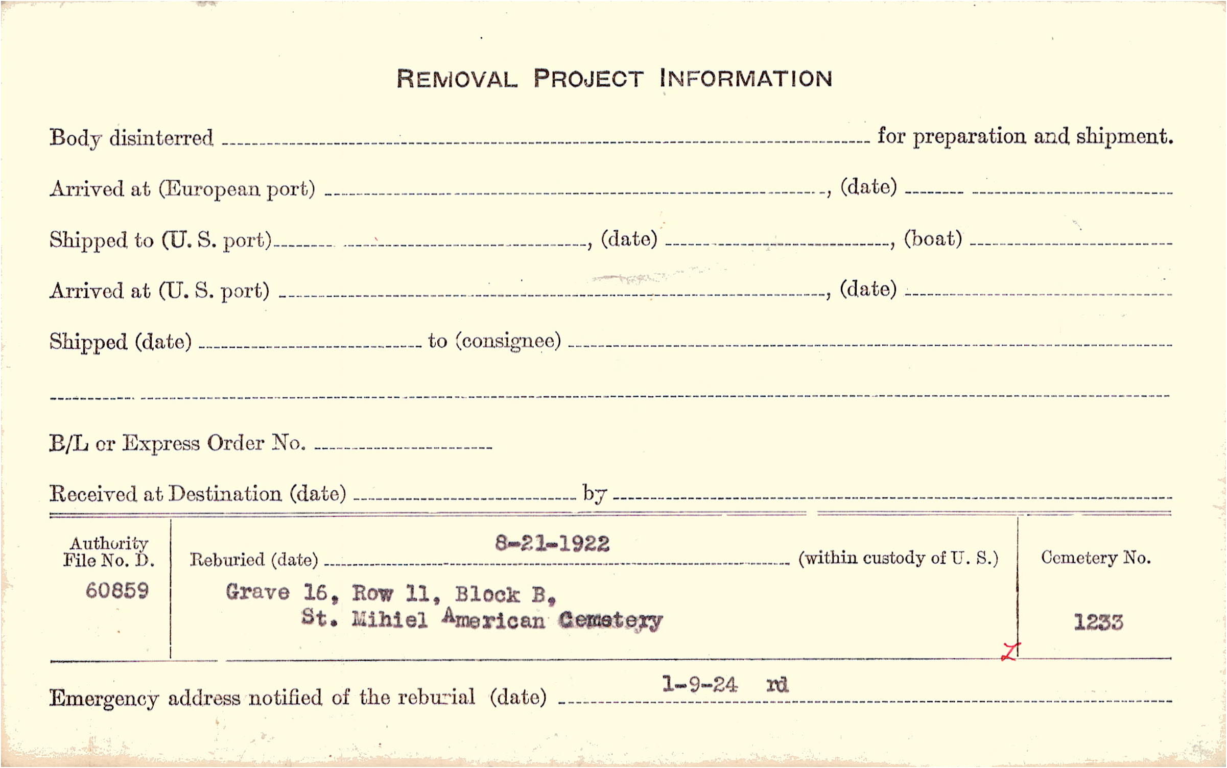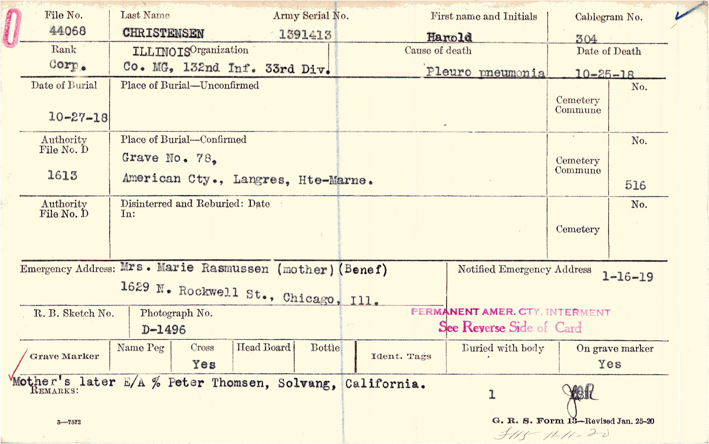 Mrs. Marie Rasmussen (mother) (Benef), 1629 N. Rockwell St., Chicago, Ill.