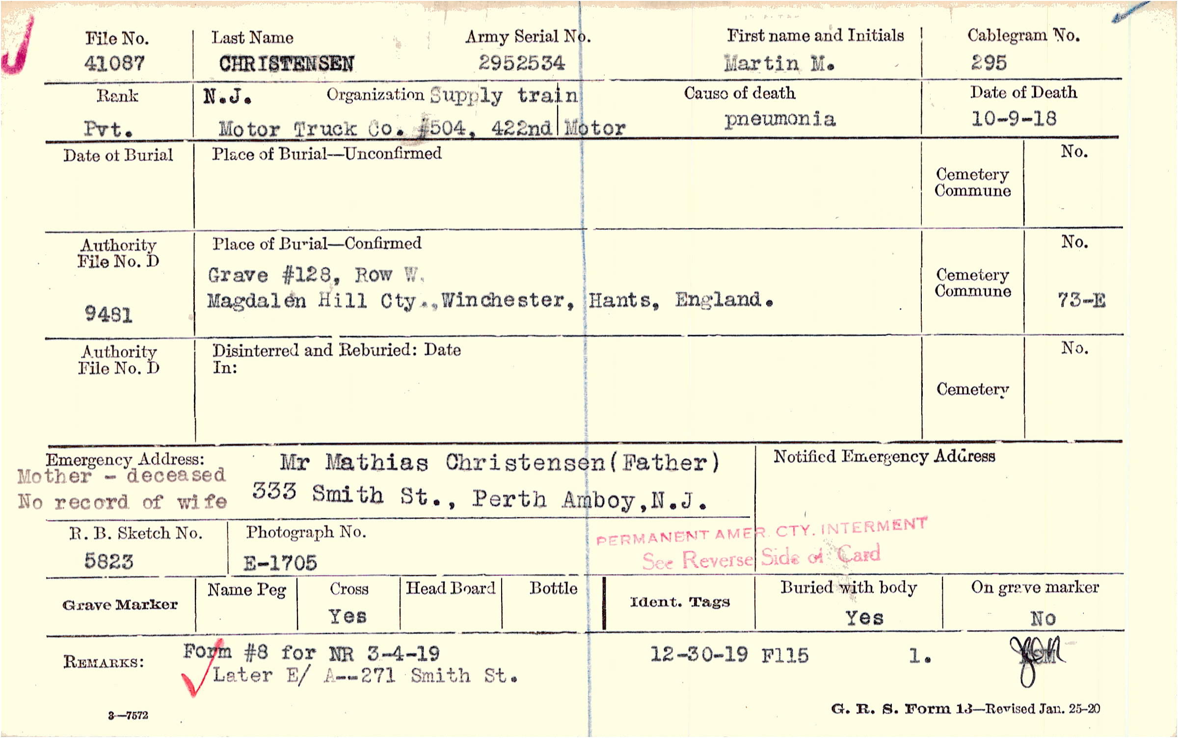 Mr Mathias Christensen (Father), 333 Smith St., Perth Amboy,N.J., Mother - deceased No record of wife