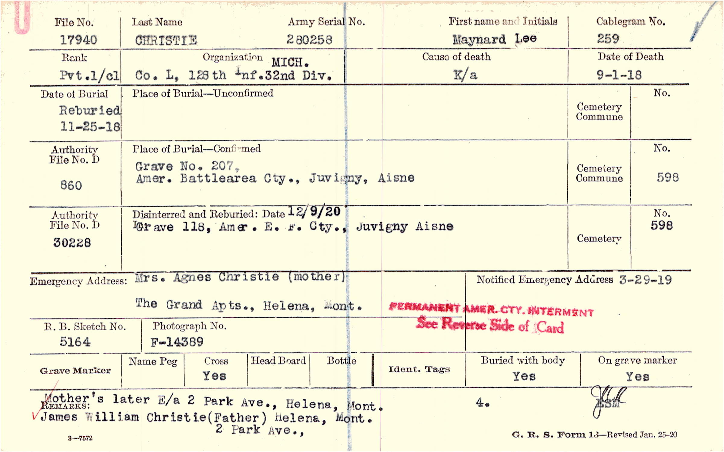 Mrs. Agnes Christie (mother), The Grand Apts., Helena, Mont., Mothers later E/a 2 Park Ave., Helena, Mont. James William Christie (father) Helena, Mont. 2 Park Ave.,