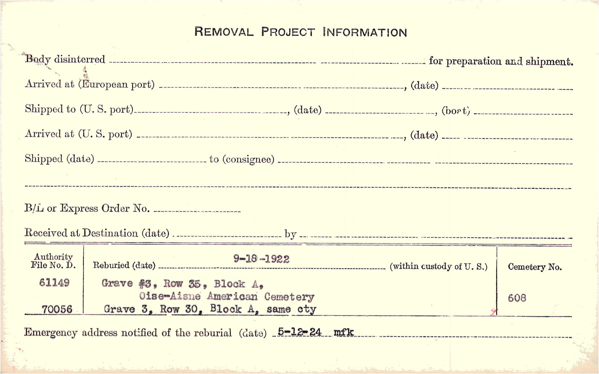 Grave 207, Amer. Battlearea Cty., Juvigny, Aisne