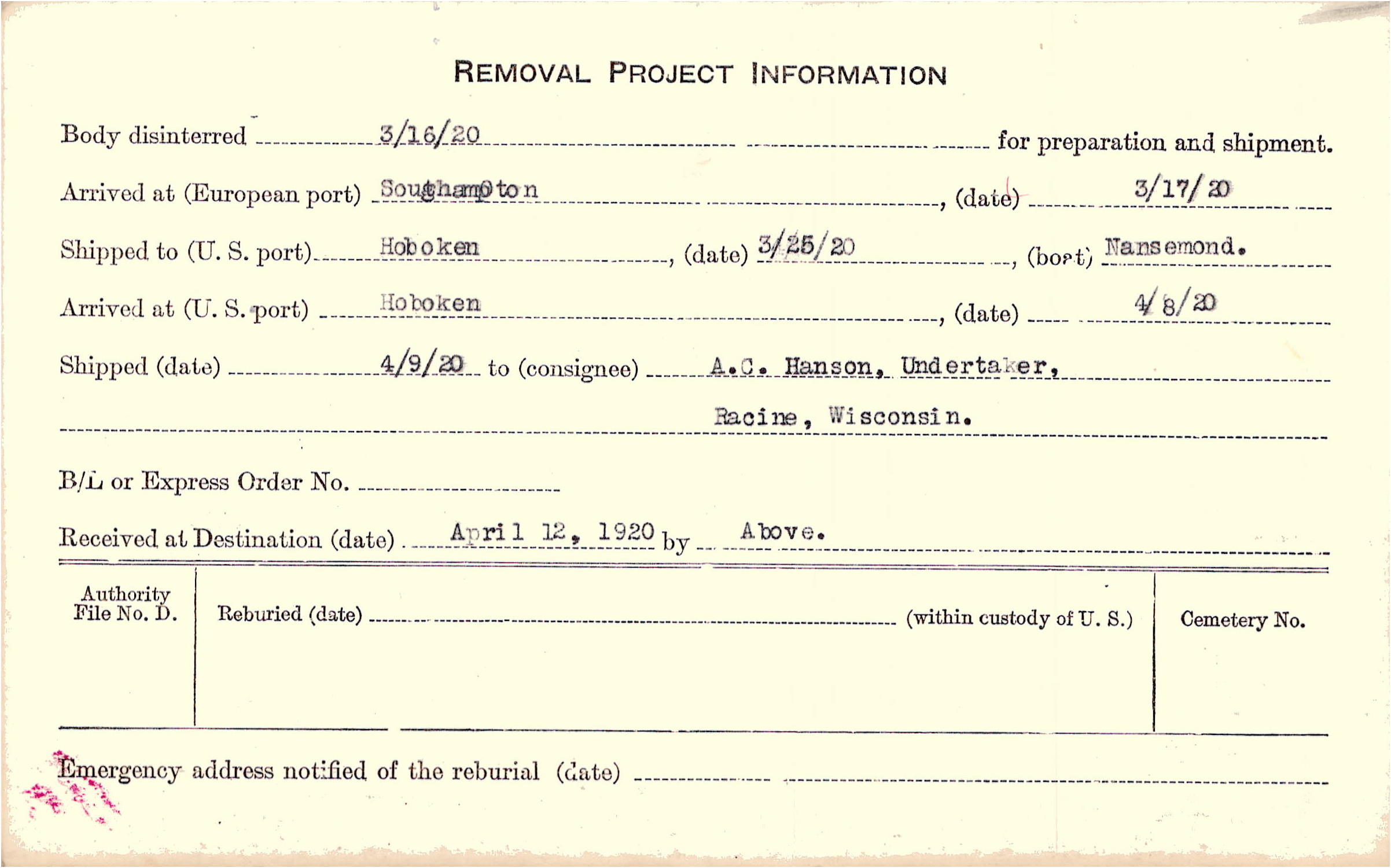 Body disinterred 3/16/1920 for preparation and shipment.