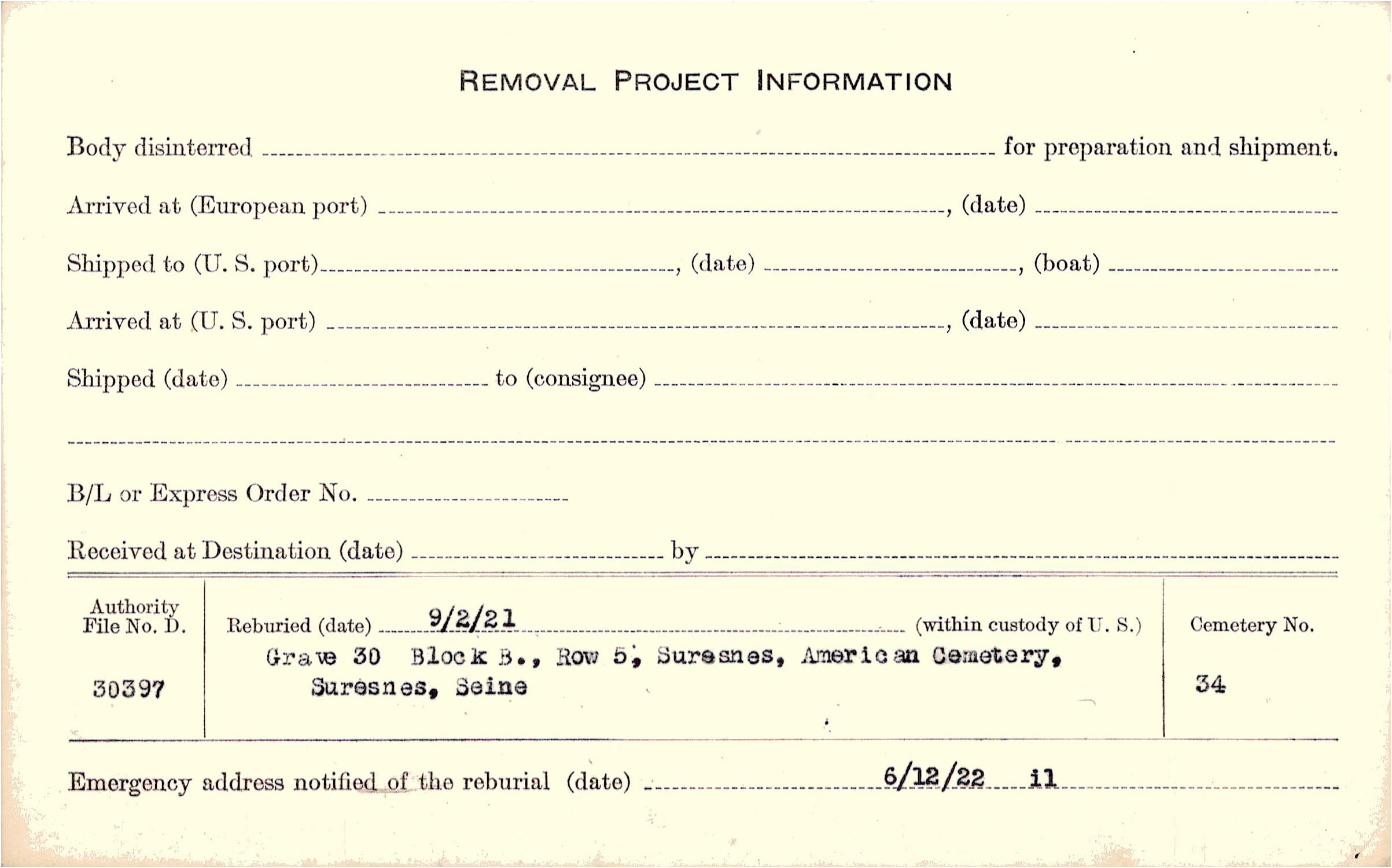 | Permanent Burial in Foreign Cemetery |