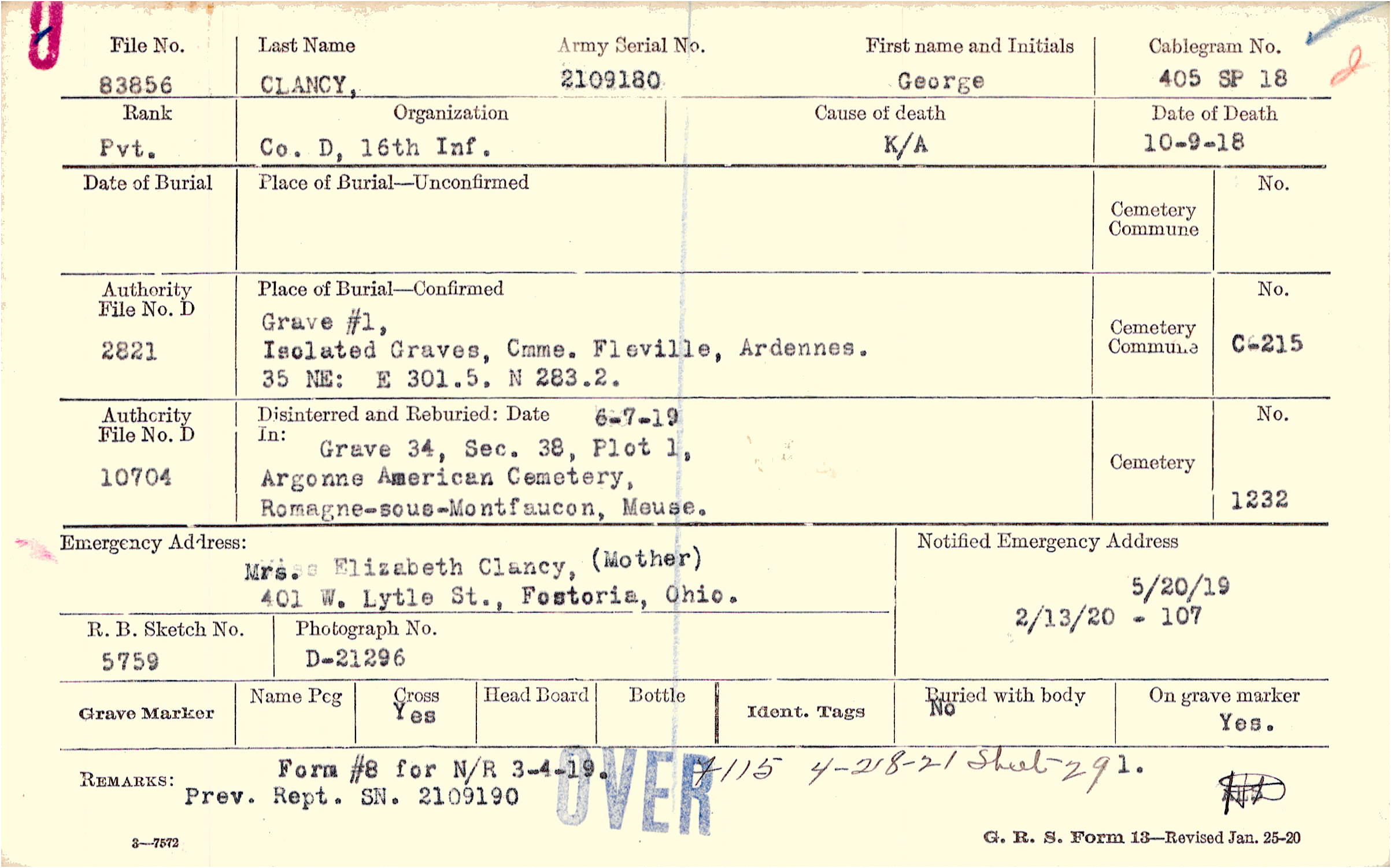 Mrs. Elizabeth Clancy, (Mother), 401 W. Lytle St., Fostoria, Ohio.