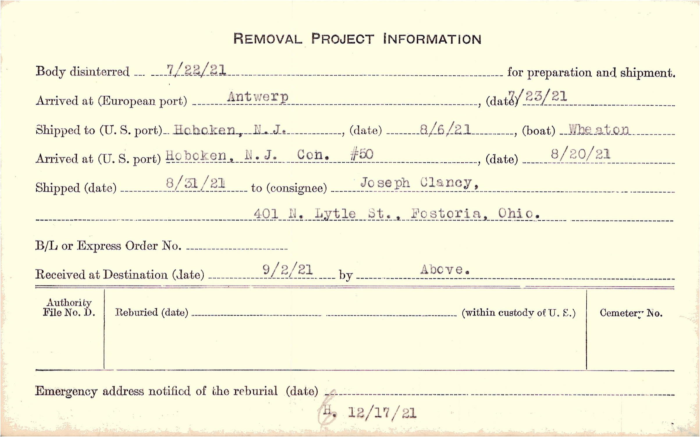 Body disinterred 7/22/1921 for preparation and shipment.