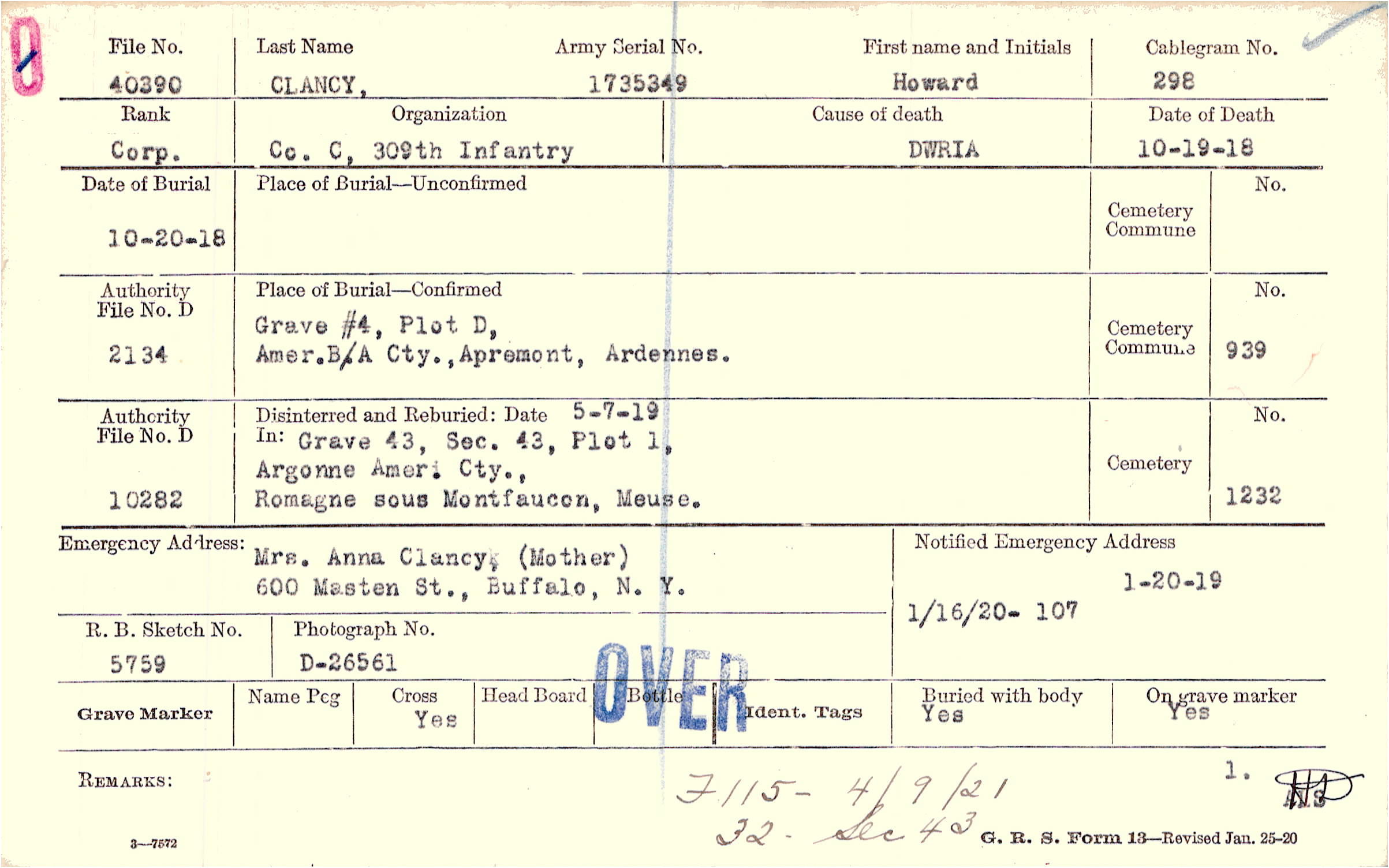 Mrs. Anna Clancy, (Mother), 600 Masten St., Buffalo, N. Y.