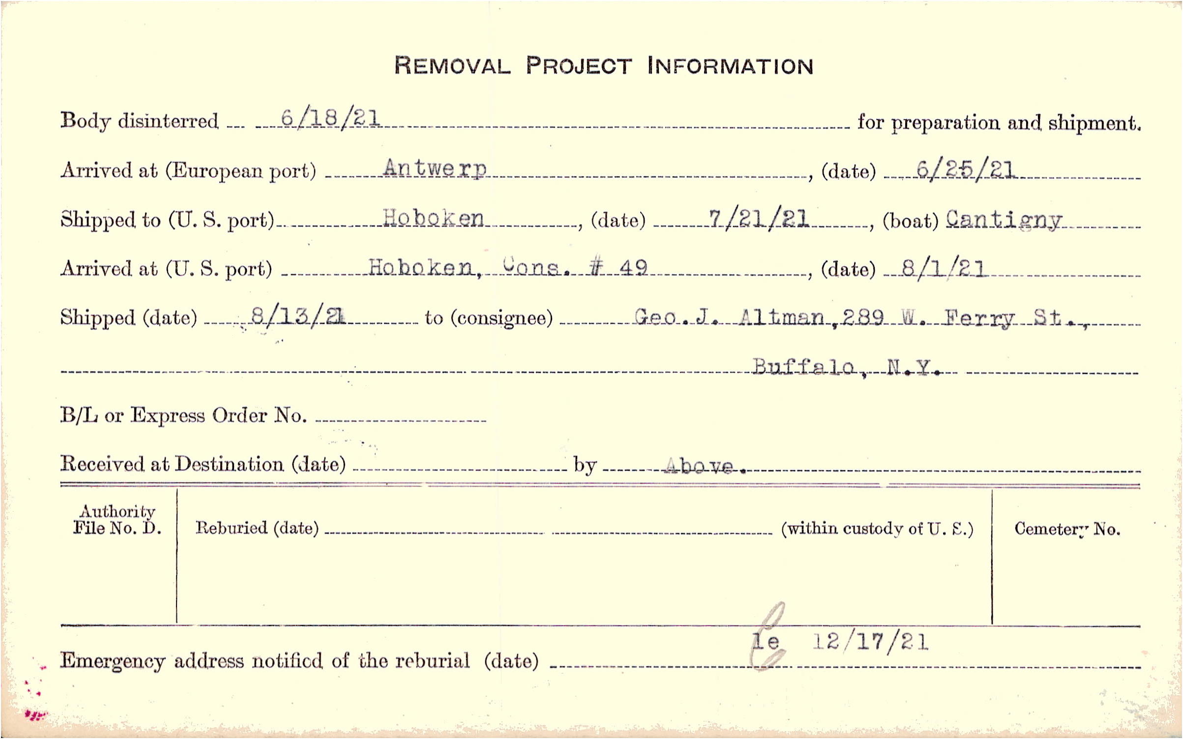 Body disinterred 6/18/1921 for preparation and shipment.