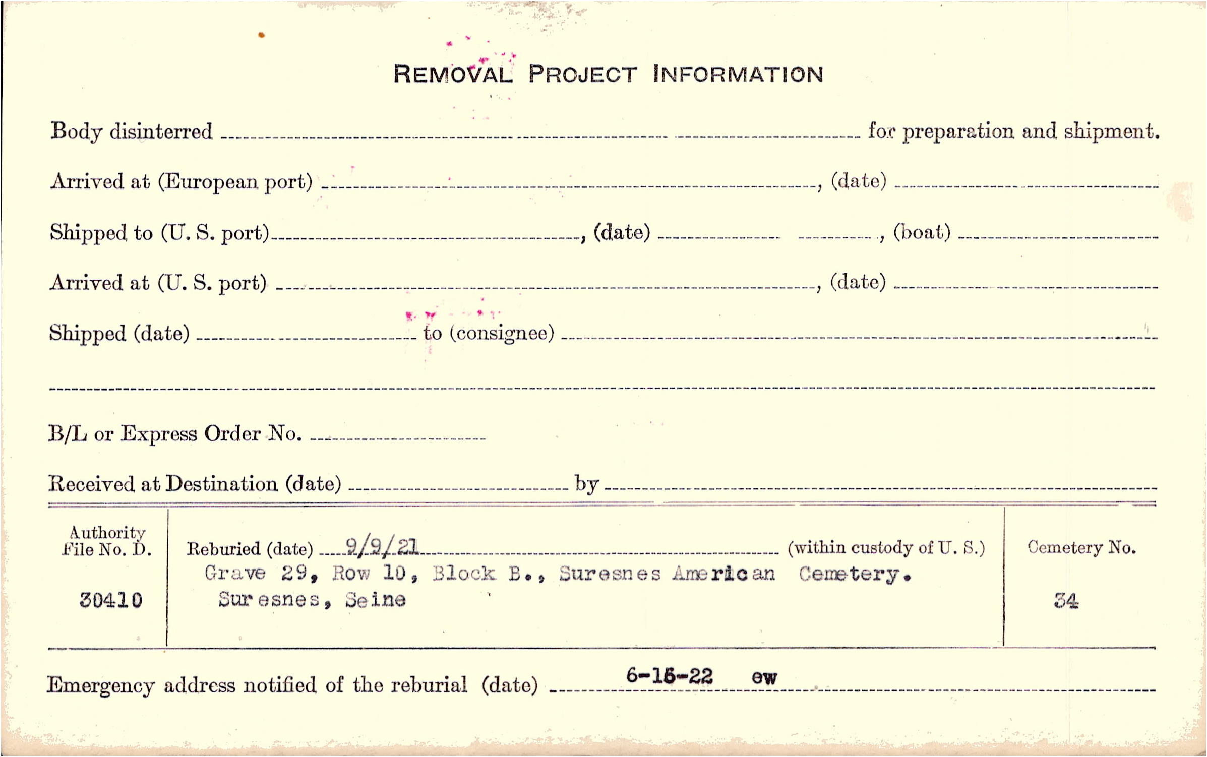 | Permanent Burial in Foreign Cemetery |