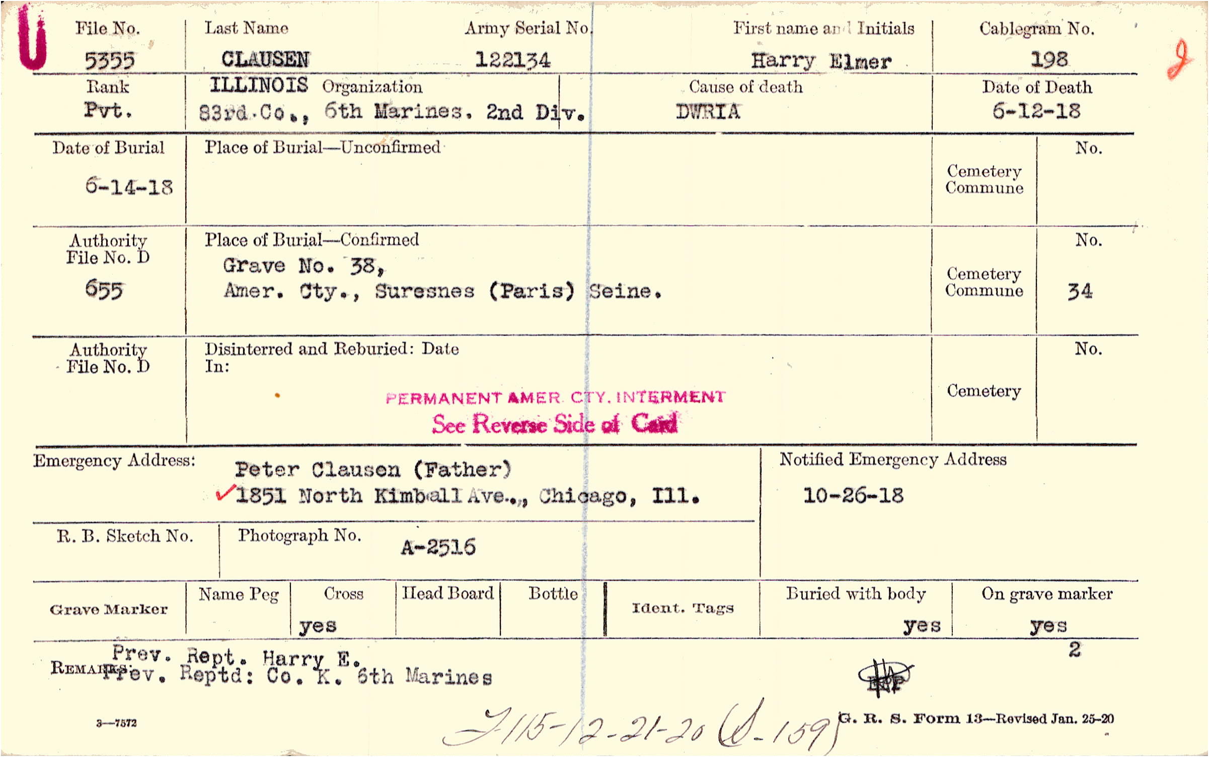 Peter Clausen (Father), 1851 North Kimball Ave., Chicago, Ill.