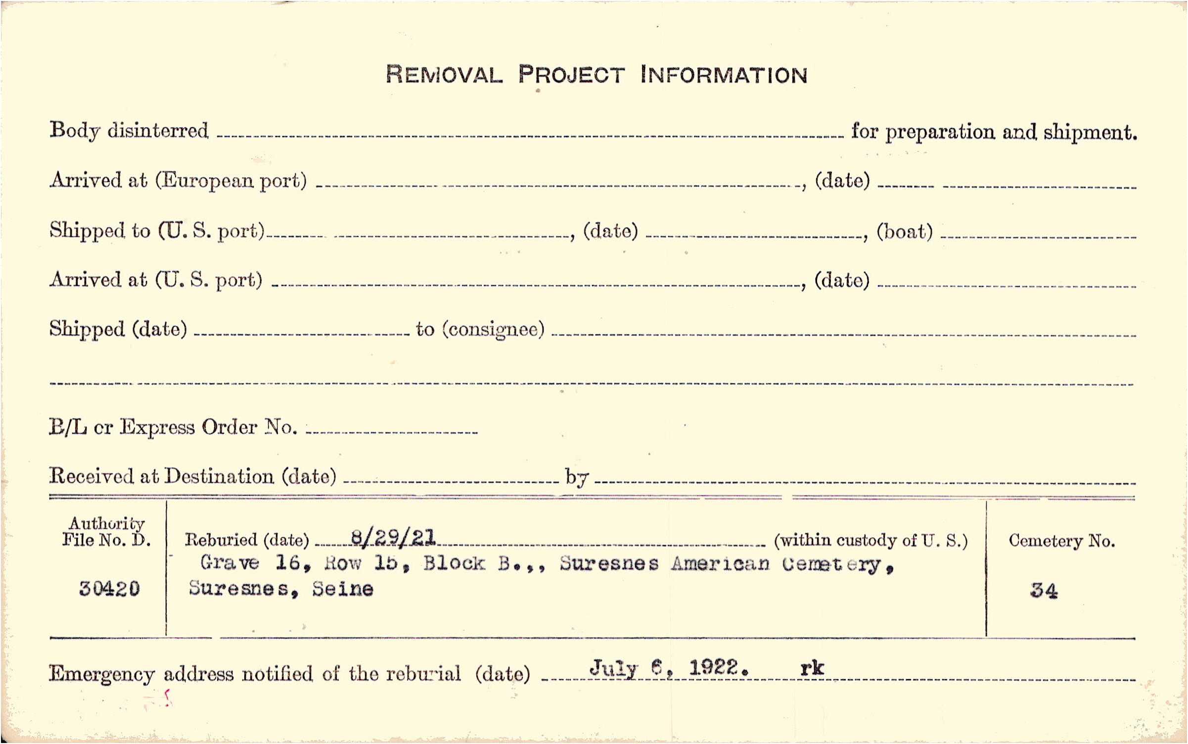 | Permanent Burial in Foreign Cemetery |