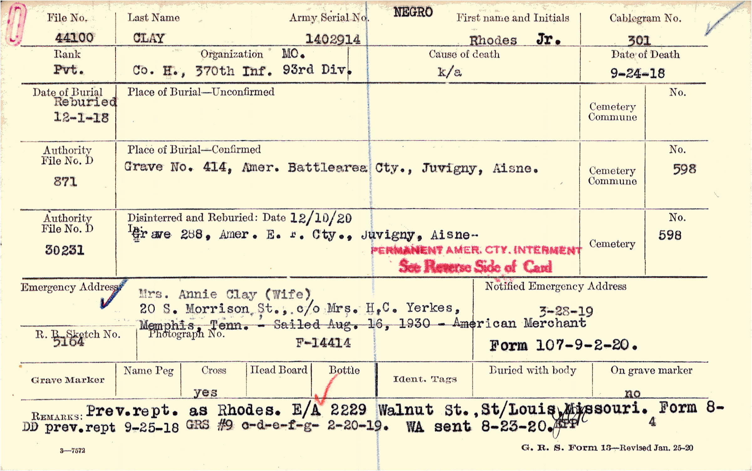 Grave 414, Amer. B attlearea Cty., Juvigny, Aisne.