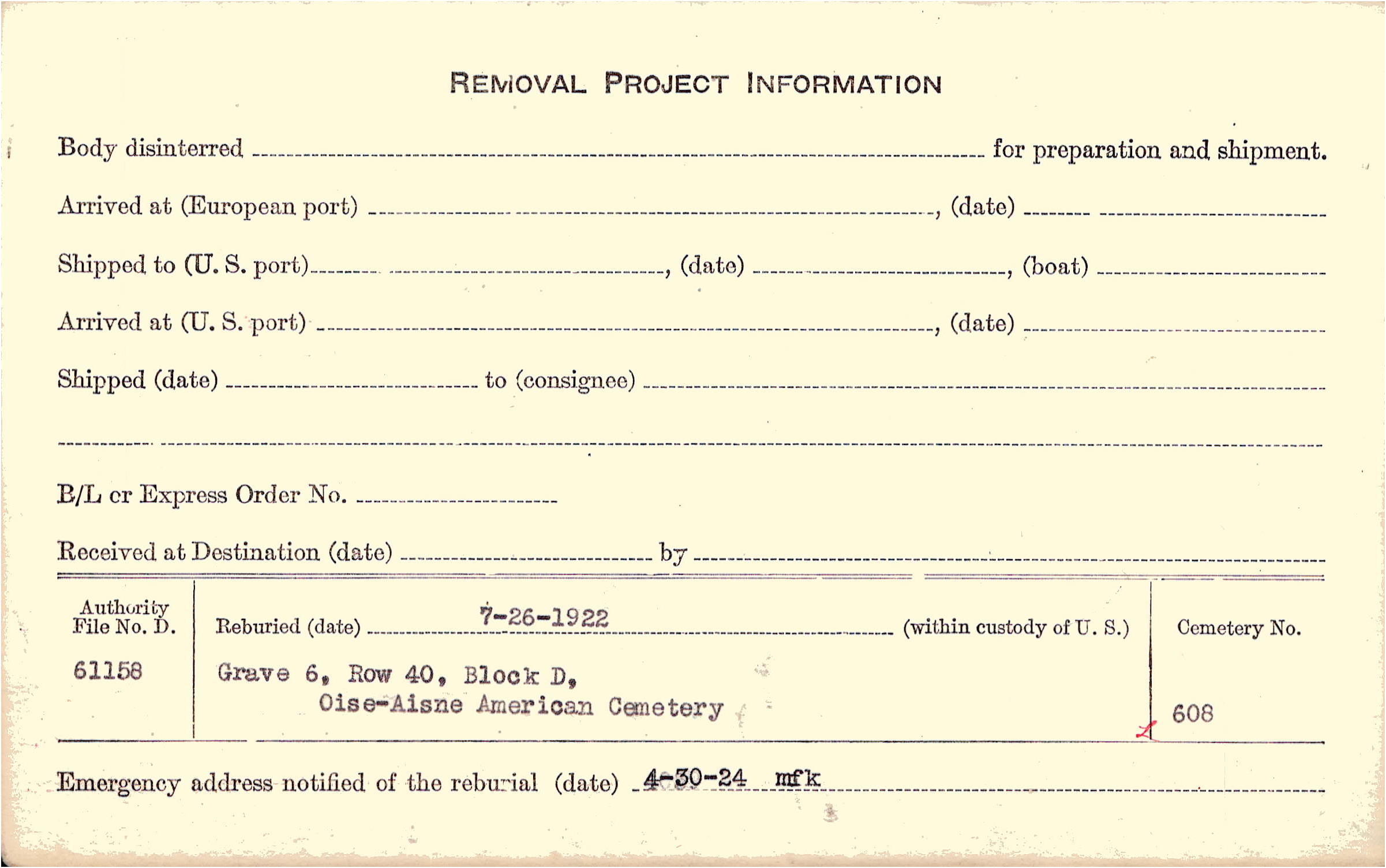 | Permanent Burial in Foreign Cemetery |