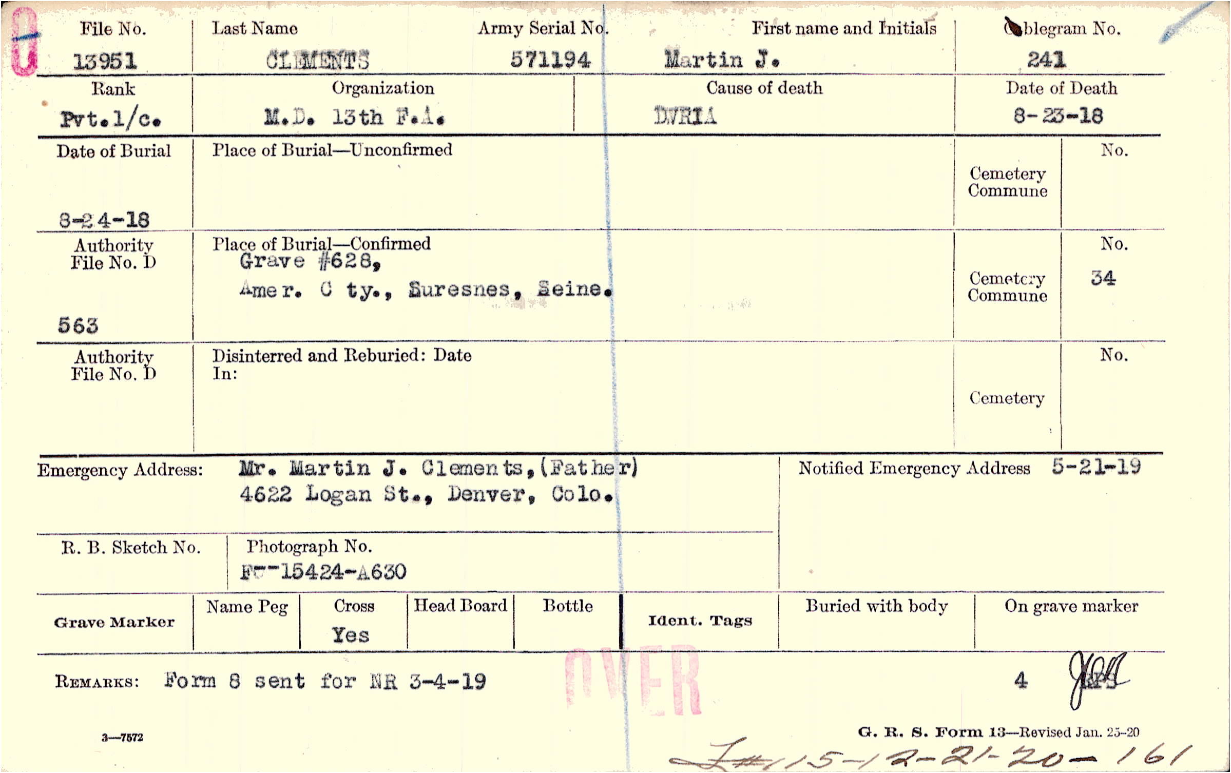Mr. Martin J. Clements,(Father), 4622 Logan St., Denver, Colo.