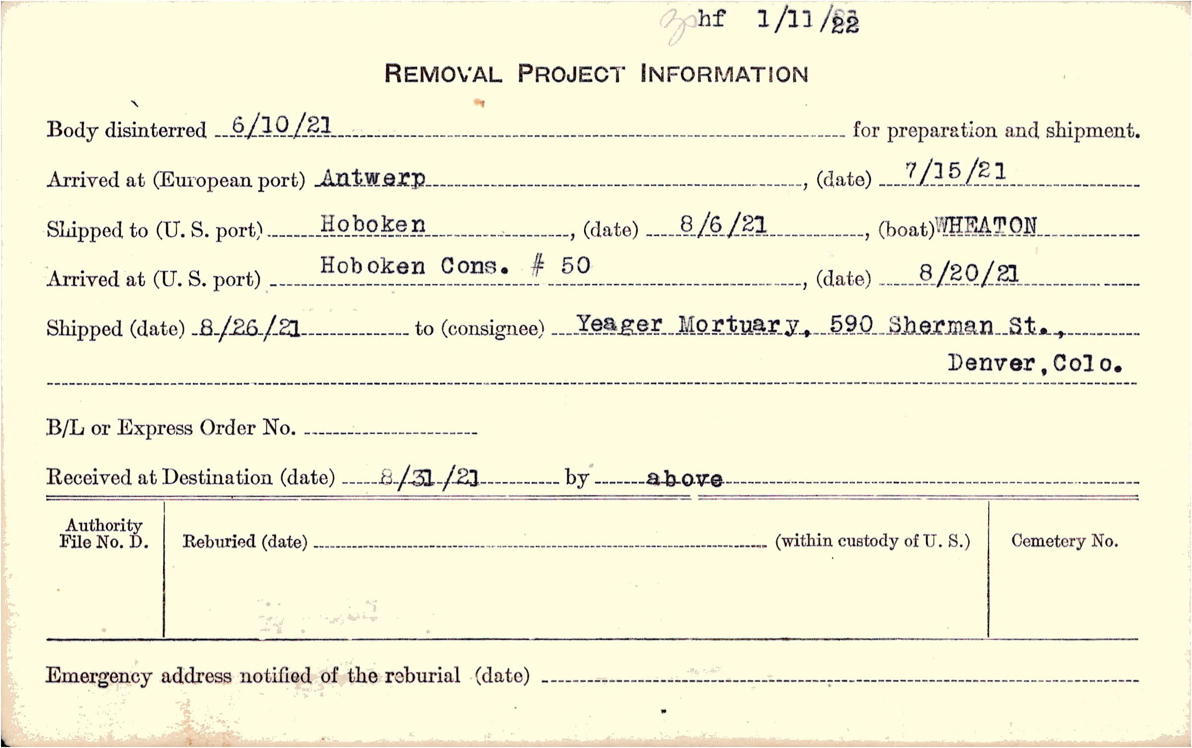 Body disinterred 6/10/1921 for preparation and shipment.