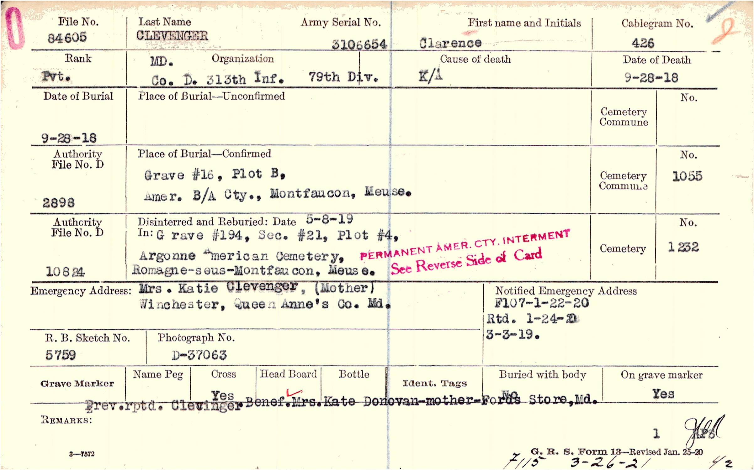 Prev. rptd. Clevinger Benef. Mrs. Kate Donovan -mother- Forus Store, Md., F115 3-26-21