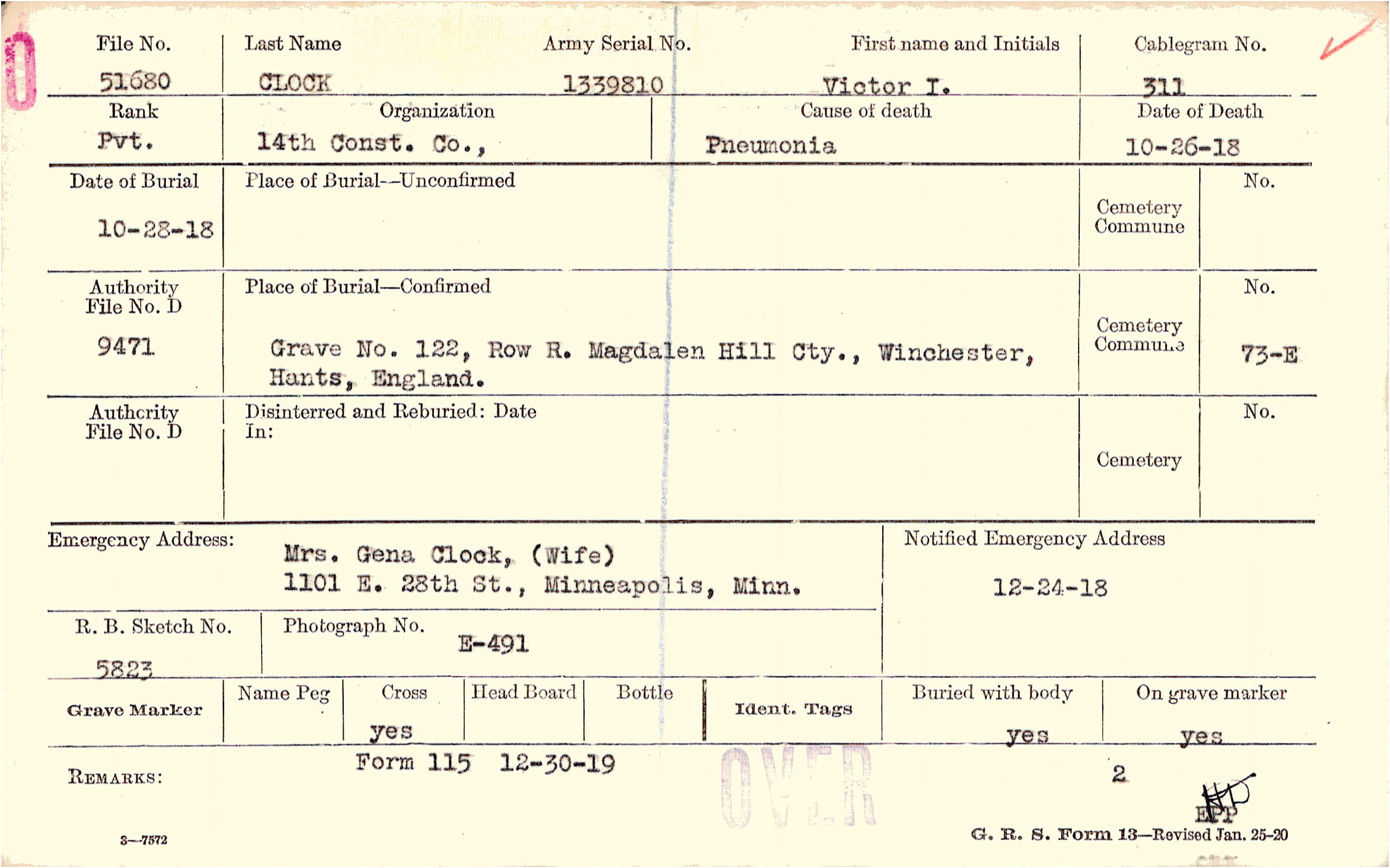 Mrs. Gena Clock, (Wife), 1101 E. 28th St., Minneapolis, Minn.