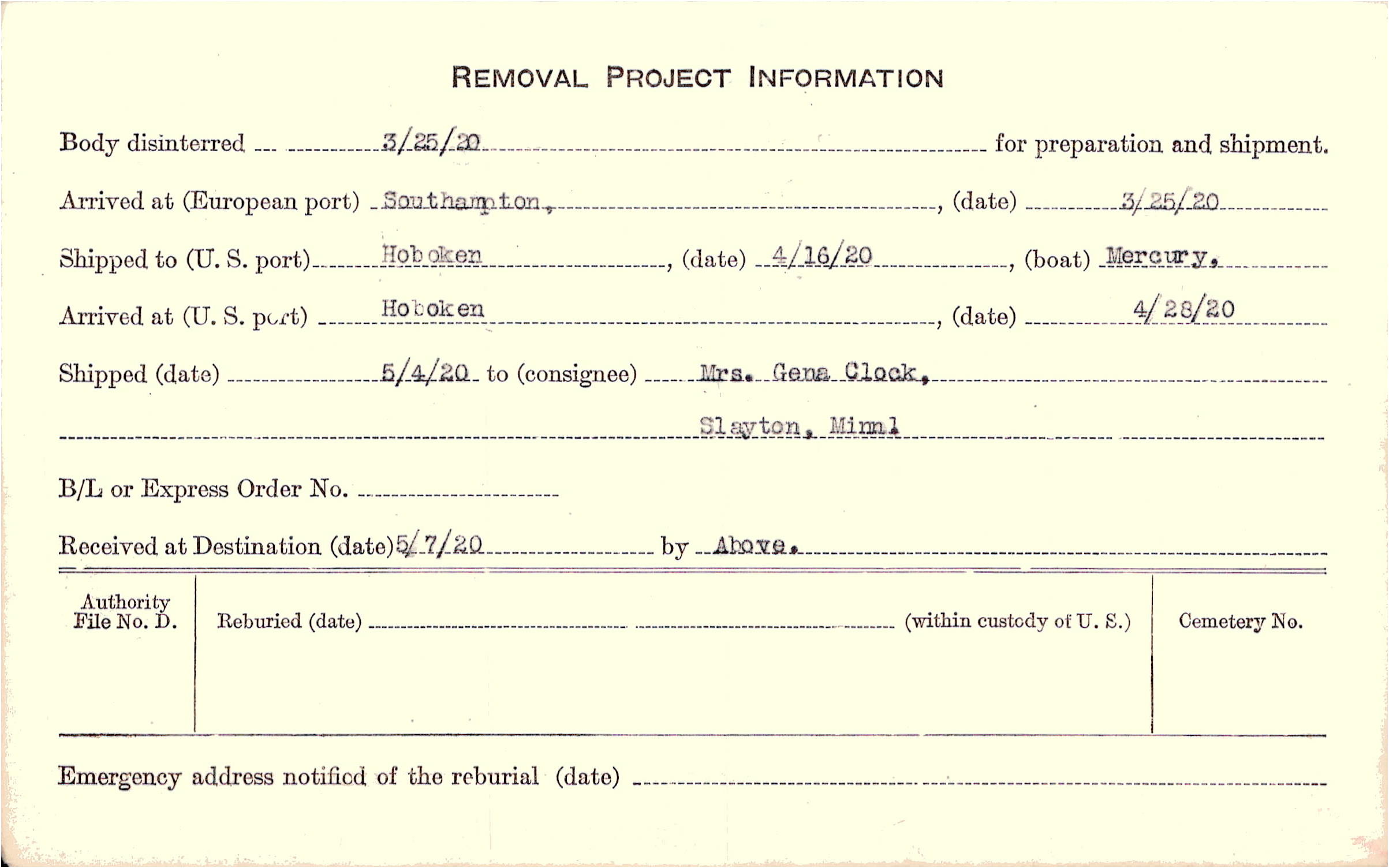 Body disinterred 3/25/1920 for preparation and shipment.