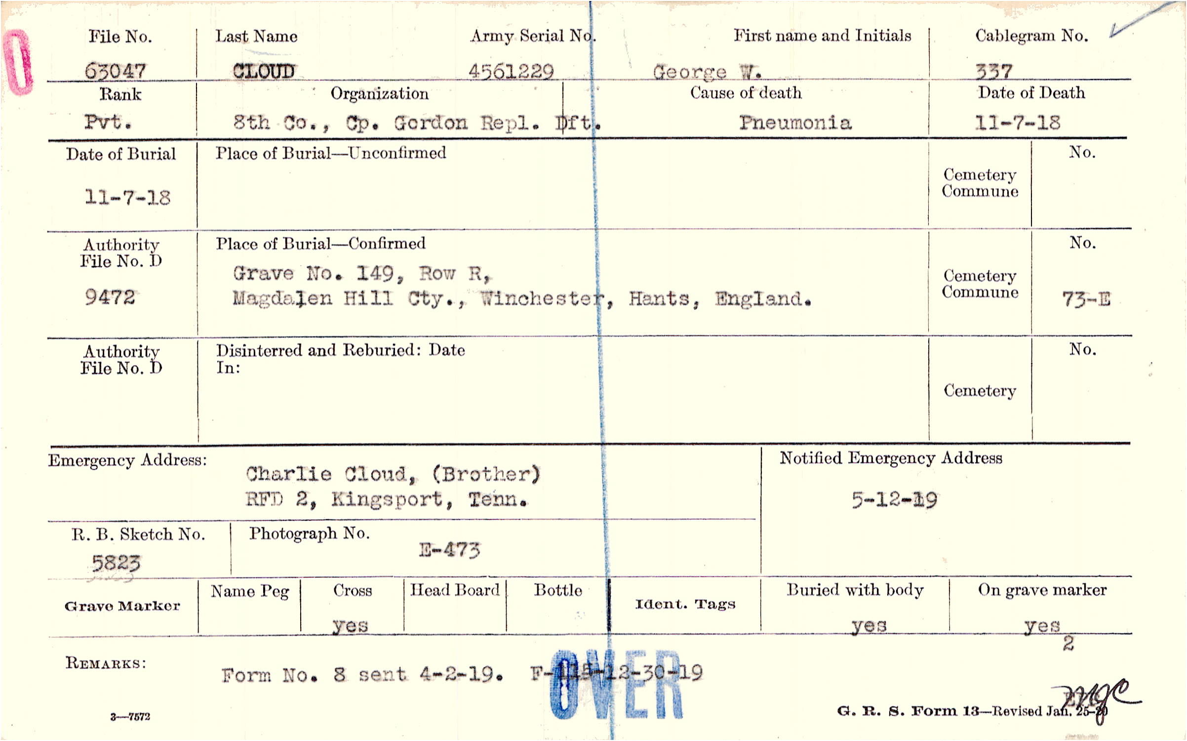 Grave 149, Row R, Magdalen Hill Cty., Winchester, Hants, England.
