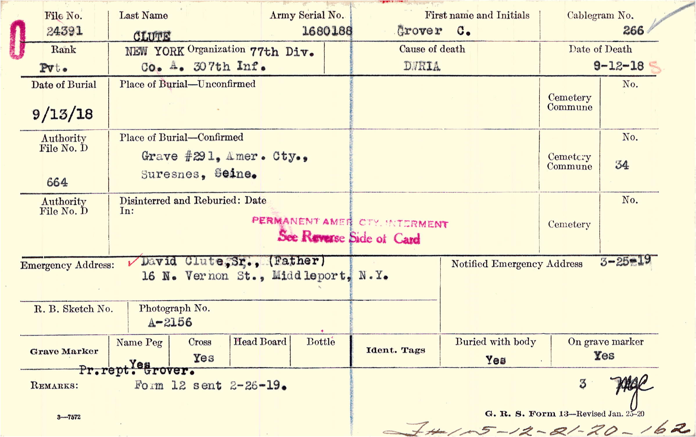 David Clute, Sr., (Father), 16 N. Vernon St., Middleport, N.Y.