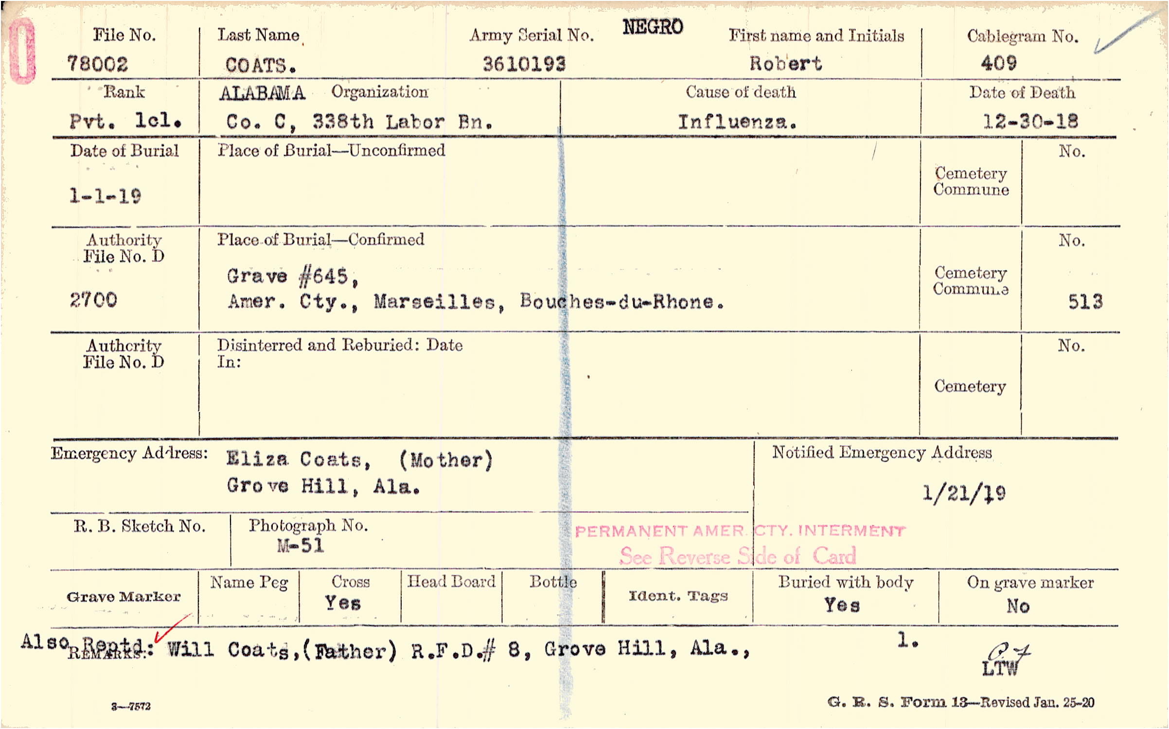Also Reptd: Will Coats, (Father) R.FD. #8, Grove Hill, Ala.,