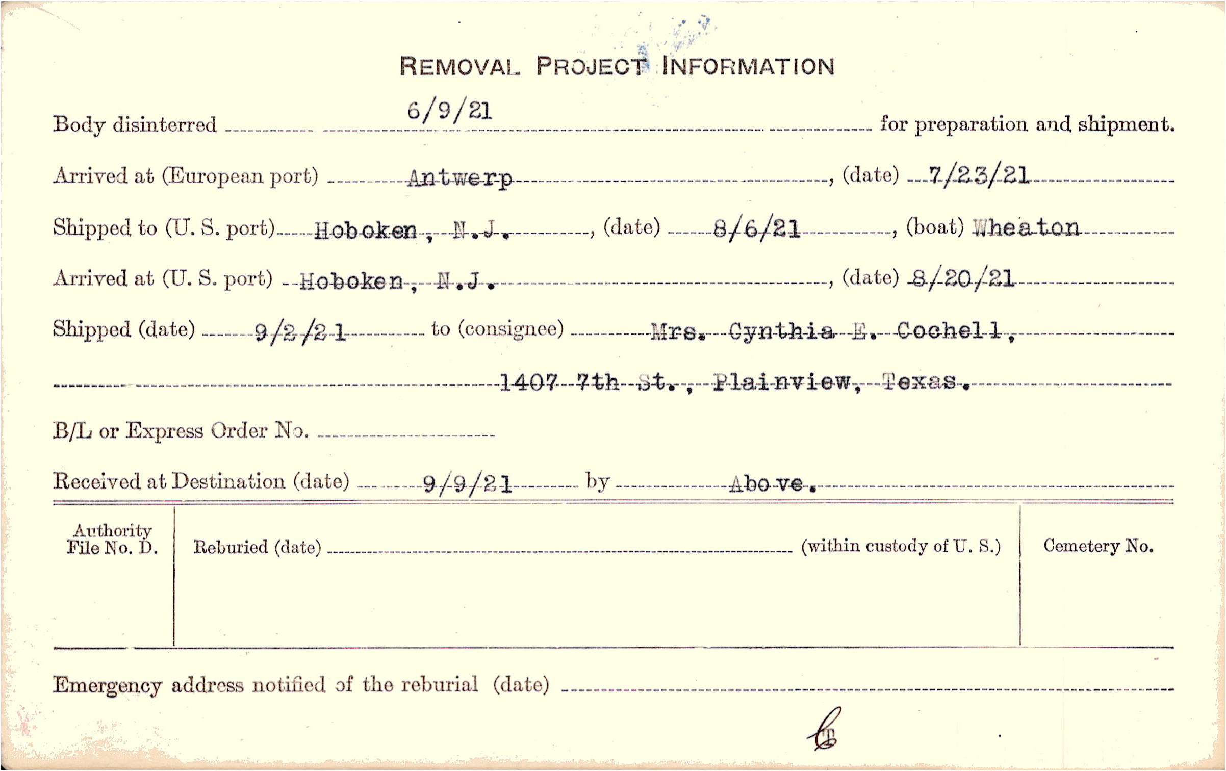 Body disinterred 6/9/1921 for preparation and shipment.