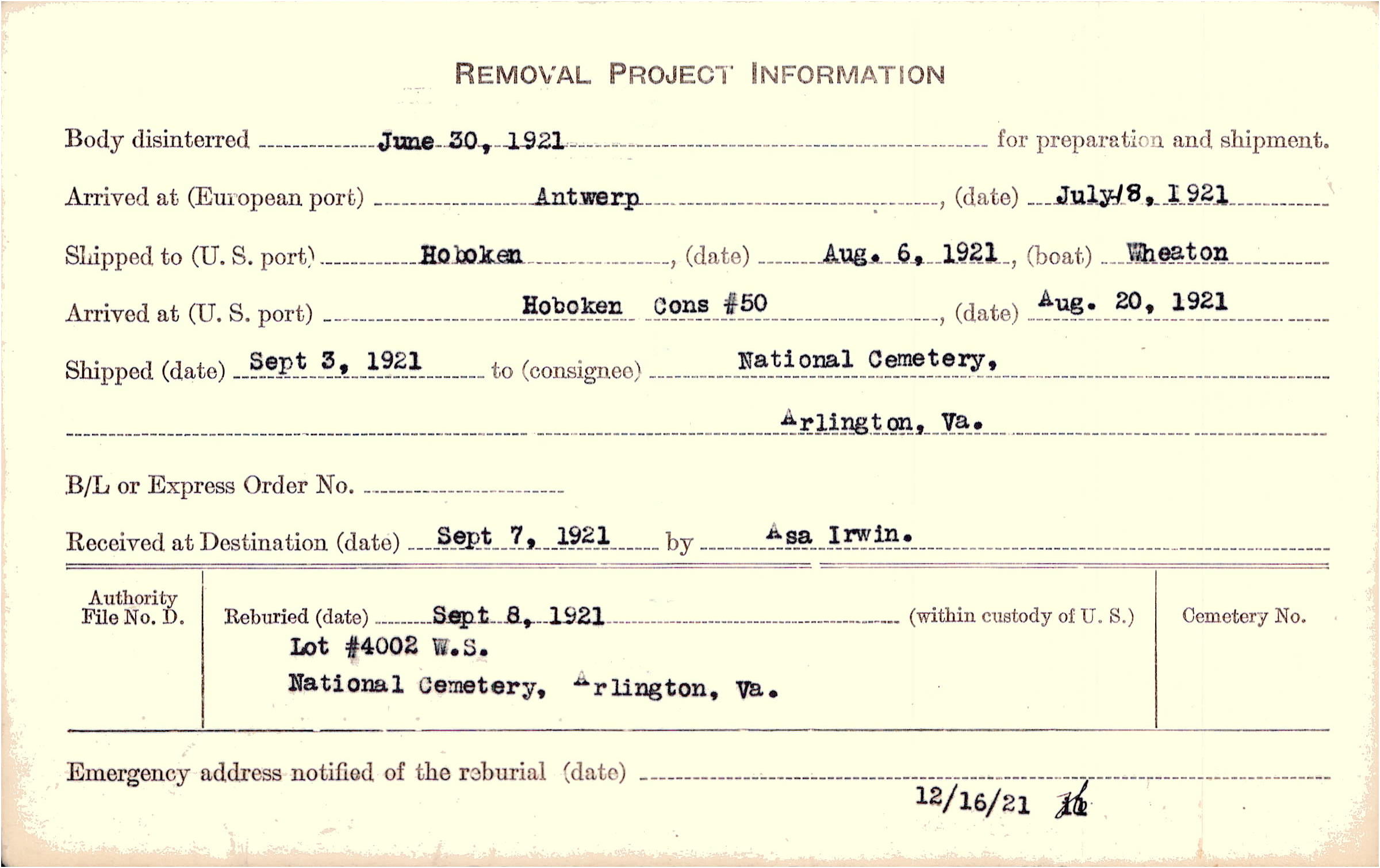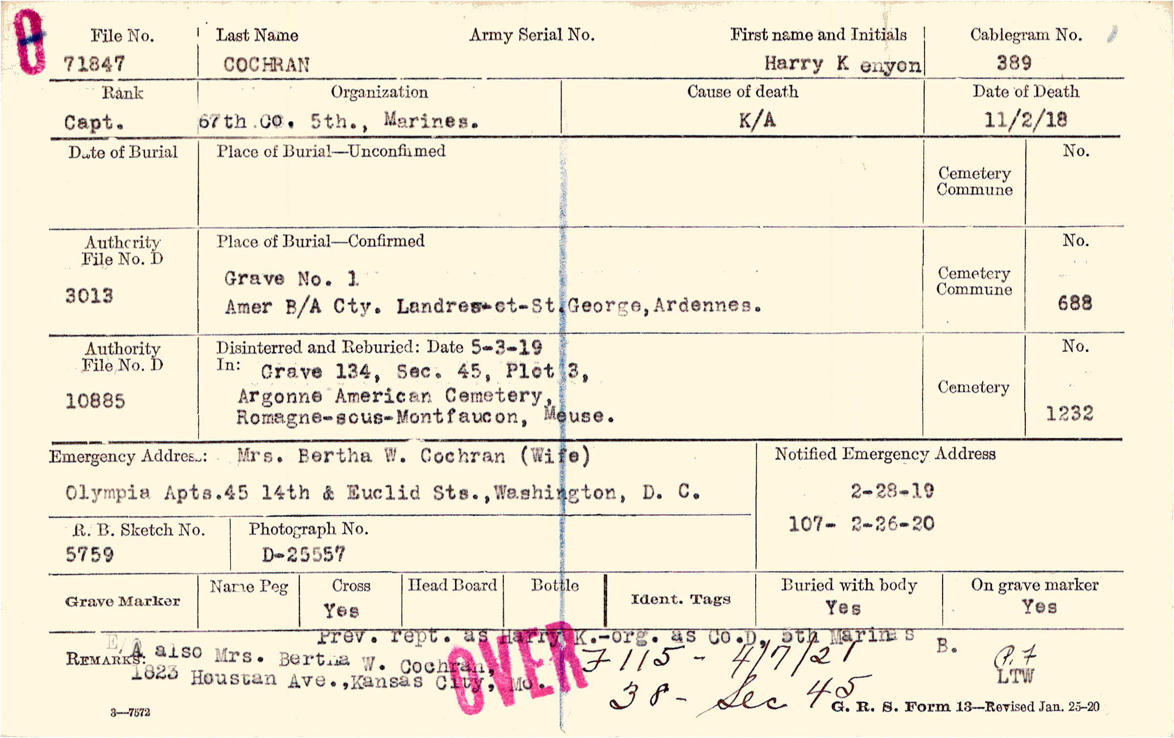 Prev. rept. as Harry K. org. as Co.D, 5th Marines B. E/A also Mrs. Bertha W. Cochran, 1823 Houstan Ave., Kansas City, Mo., F115 - 4/7/21 38 - Sec 45