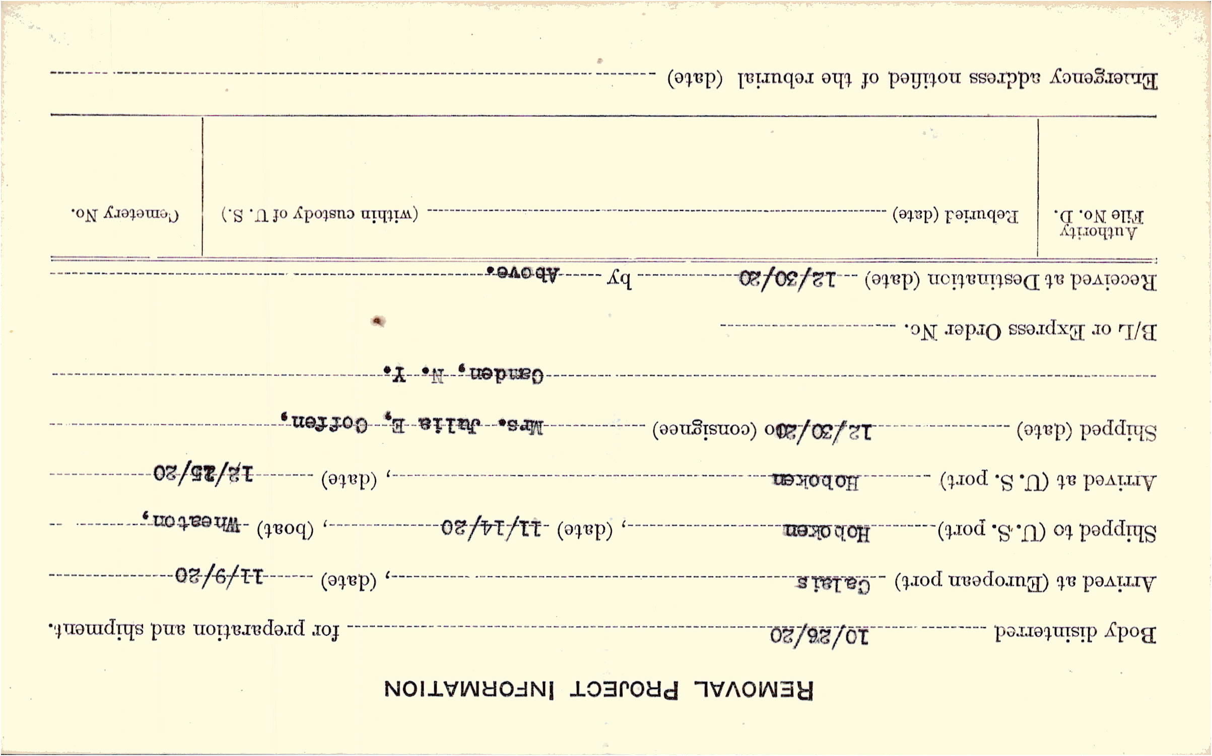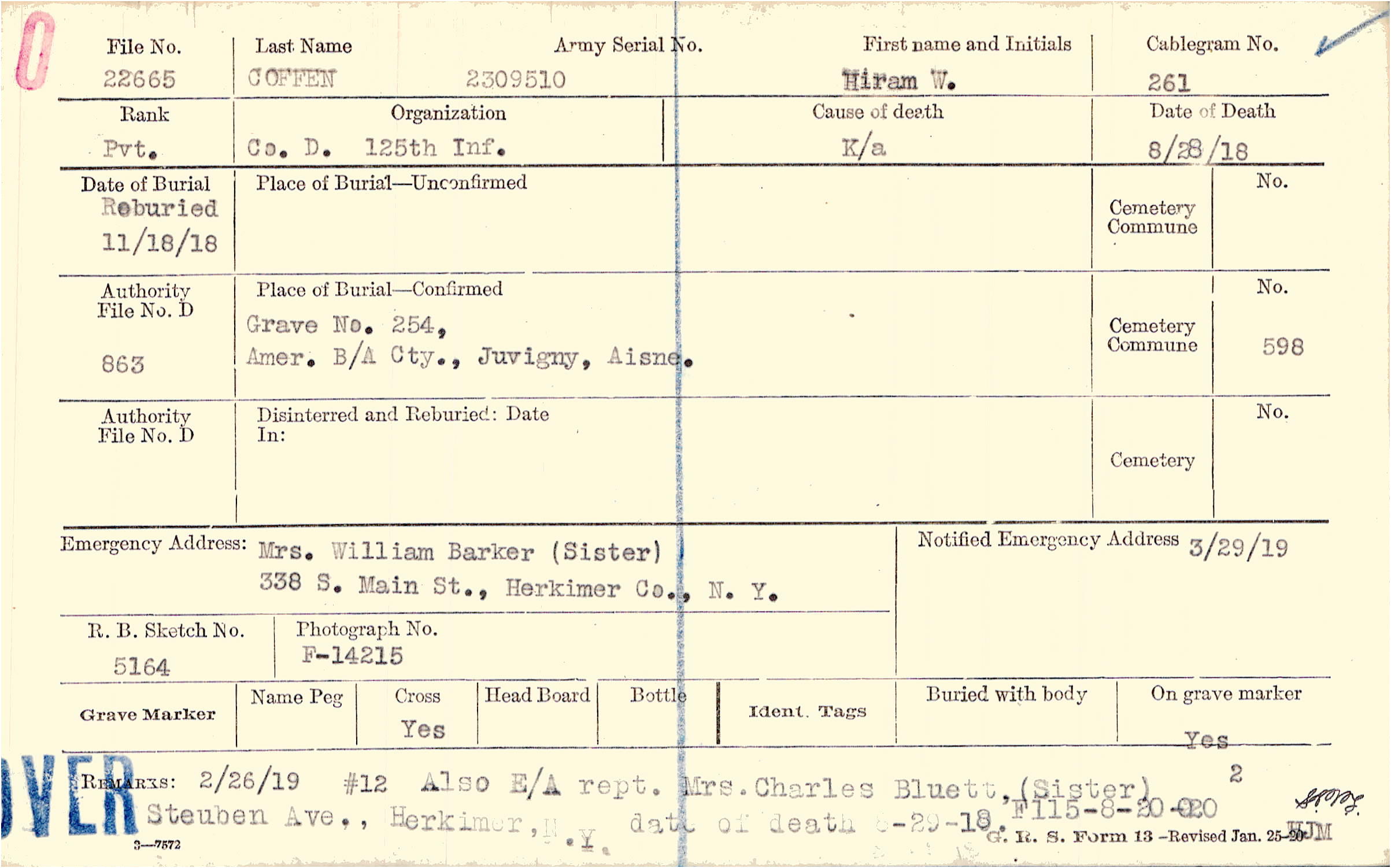 Also E/A rept. Mrs. Charles Bluett, (Sister), Steuben, Ave., Herkimer, N.Y. date of death 8-29-18