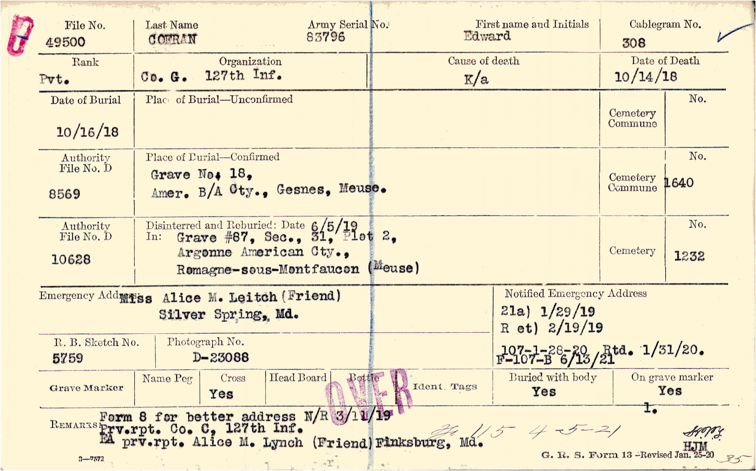 Prv.rpt. Co. C, 127th Inf. EA prv.rpt. Alice M. Lynch (Friend) Finksburg, Md., Form 8 for better address N/R 3/11/19, F 115 4-5-21