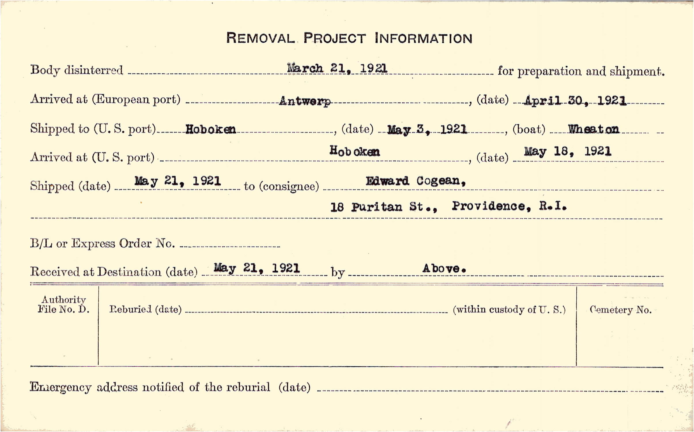 Body disinterred 3/21/1921 for preparation and shipment.