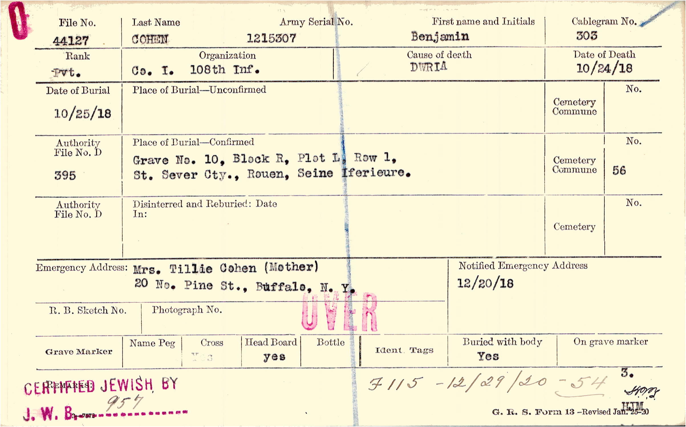 Mrs. Tillie Cohen (Mother), 20 No. Pine St., Buffalo, N.Y.