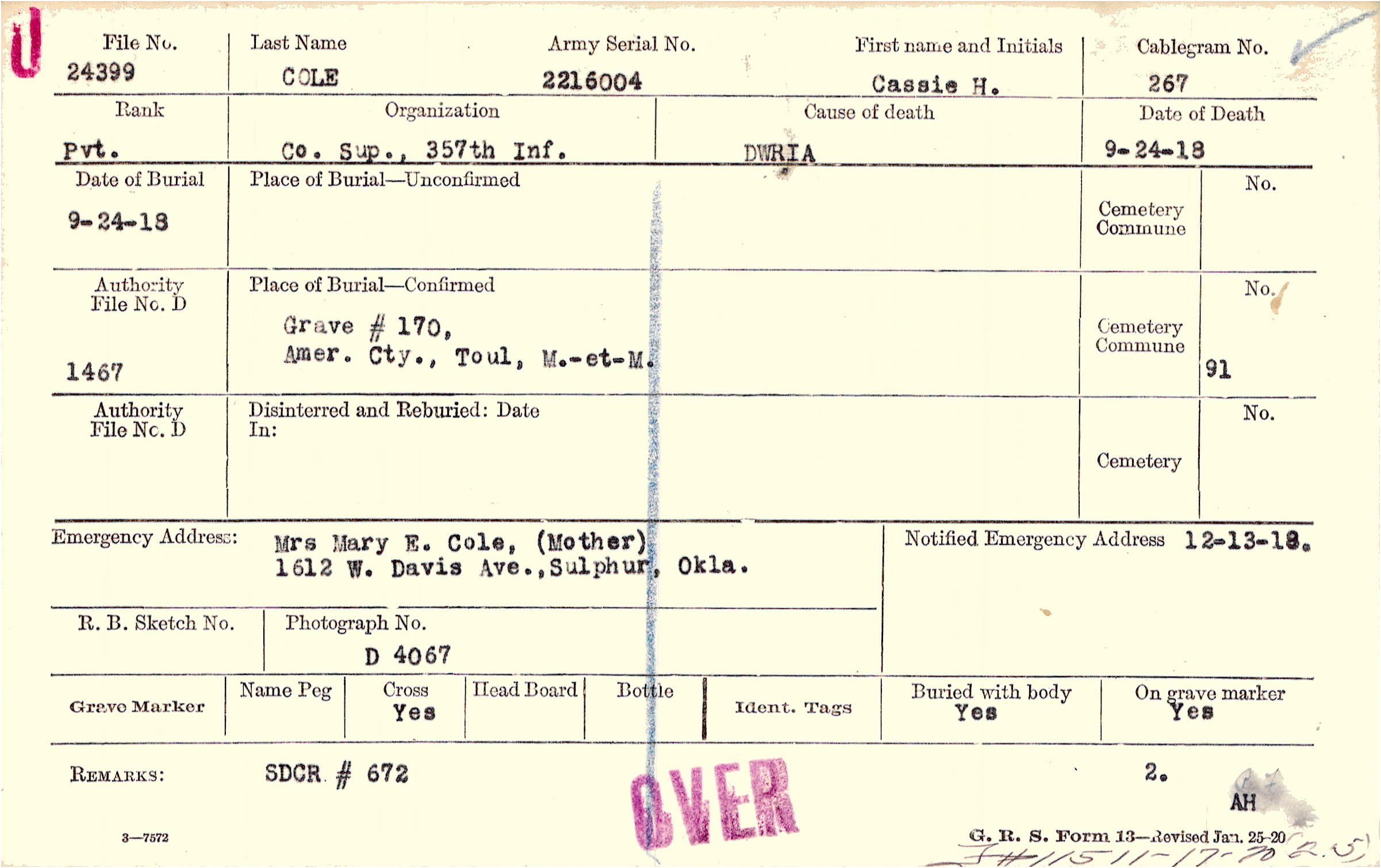 Mrs Mary E. Cole, (Mother), 1612 W. Davis Ave.,Sulphur, Okla.