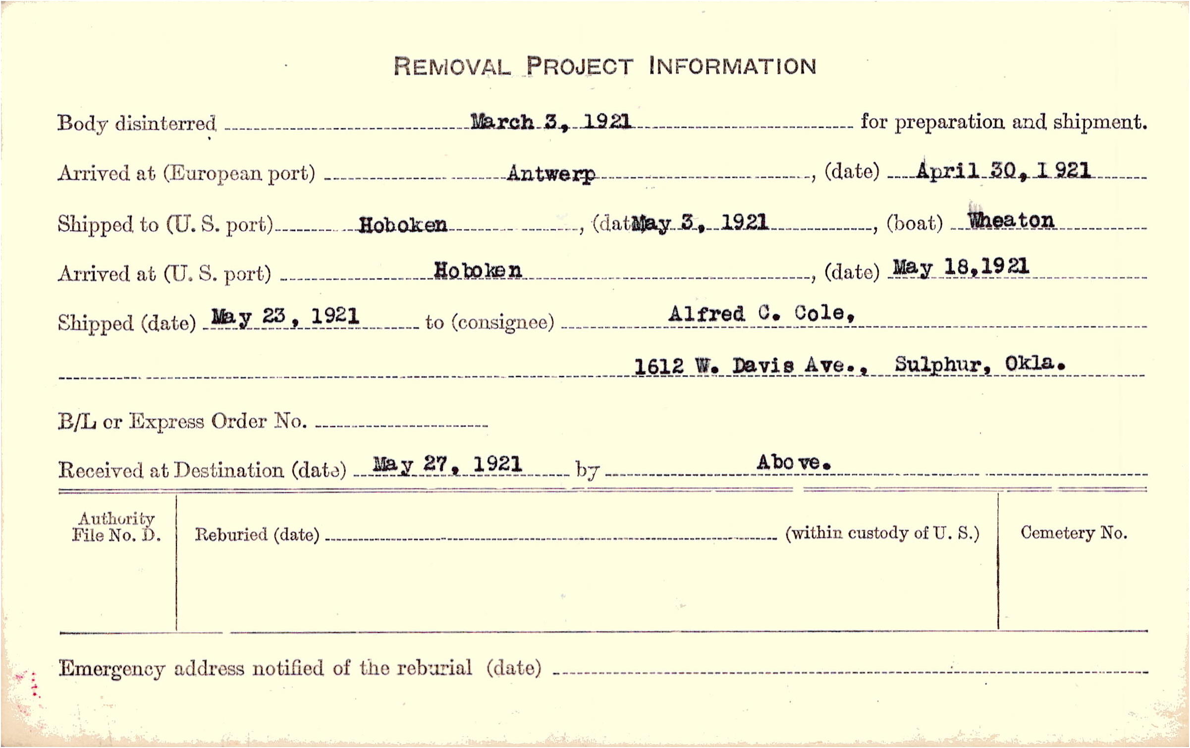 Body disinterred 3/3/1921 for preparation and shipment.