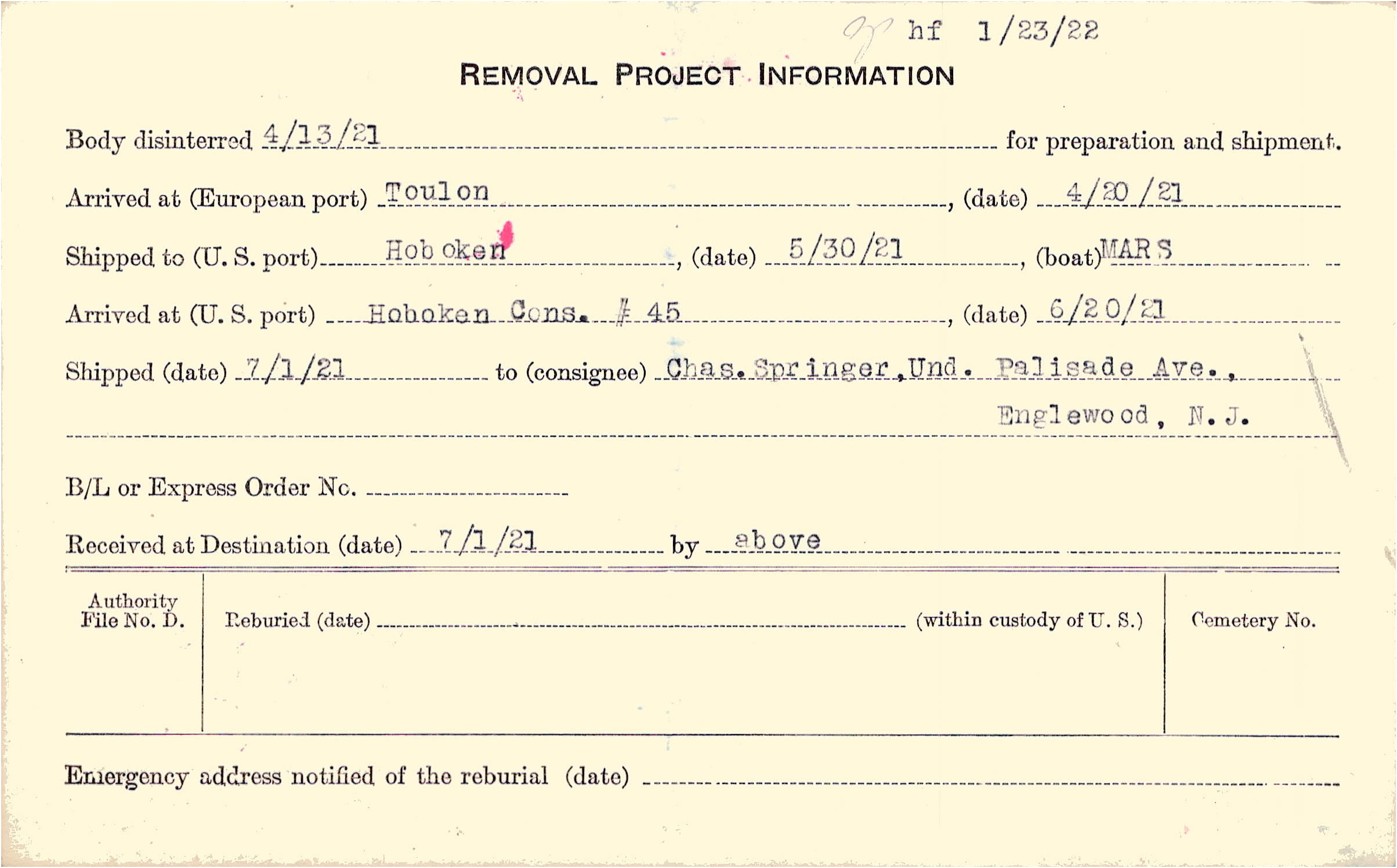 Body disinterred 4/13/1921 for preparation and shipment.