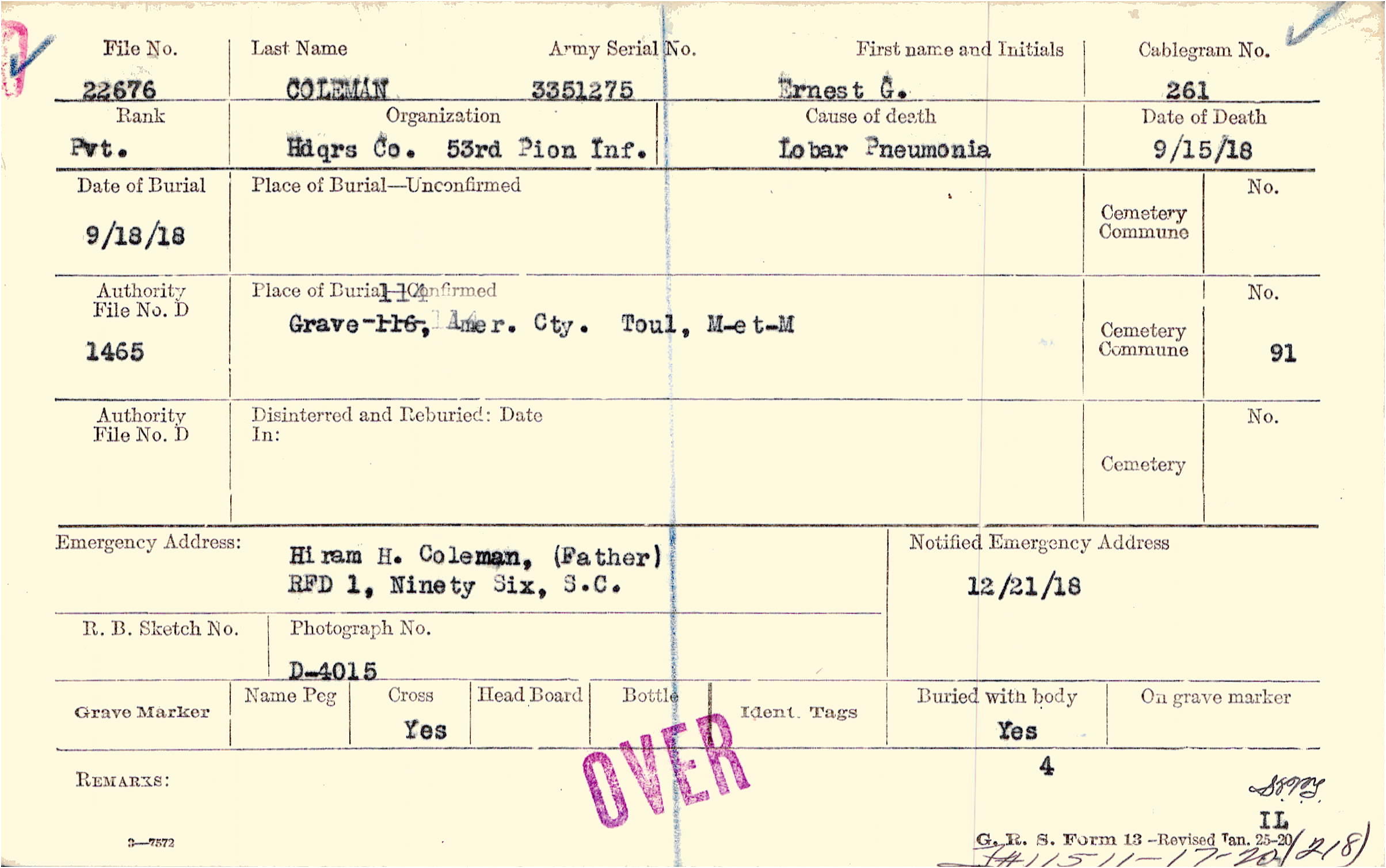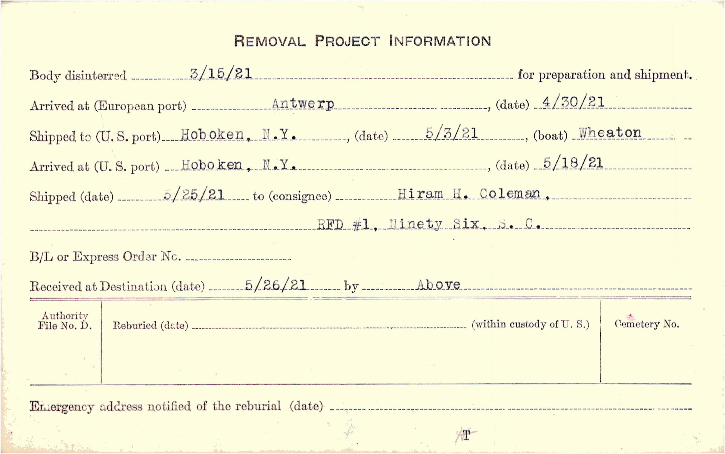 Hiram H. Coleman, (Father), RFD 1, Ninety Six, S.C.