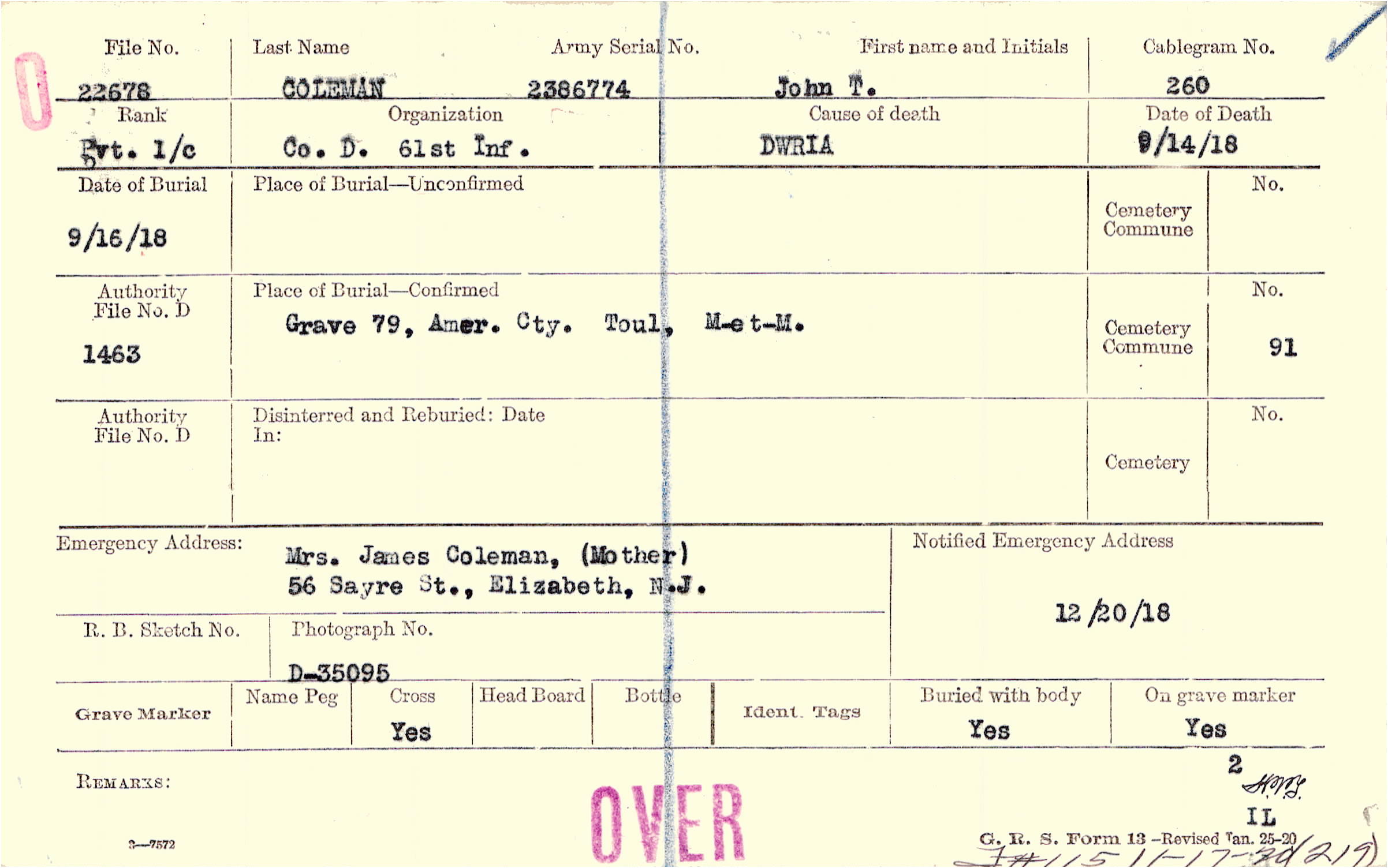 Mrs. James Coleman, (Mother), 56 Sayre St., Elizabeth, N.J.
