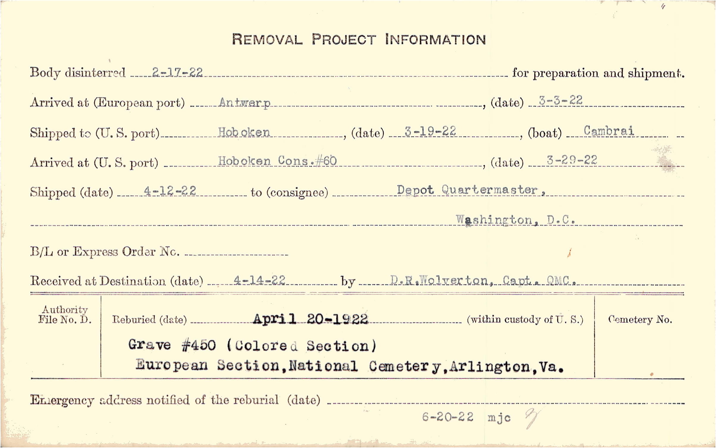Body disinterred 2/17/1922 for preparation and shipment.