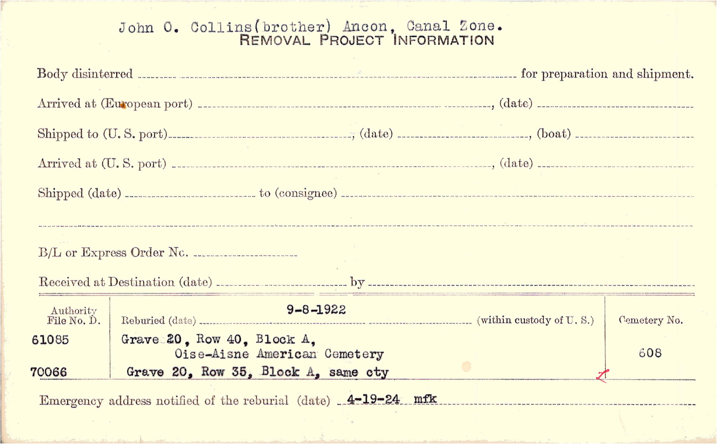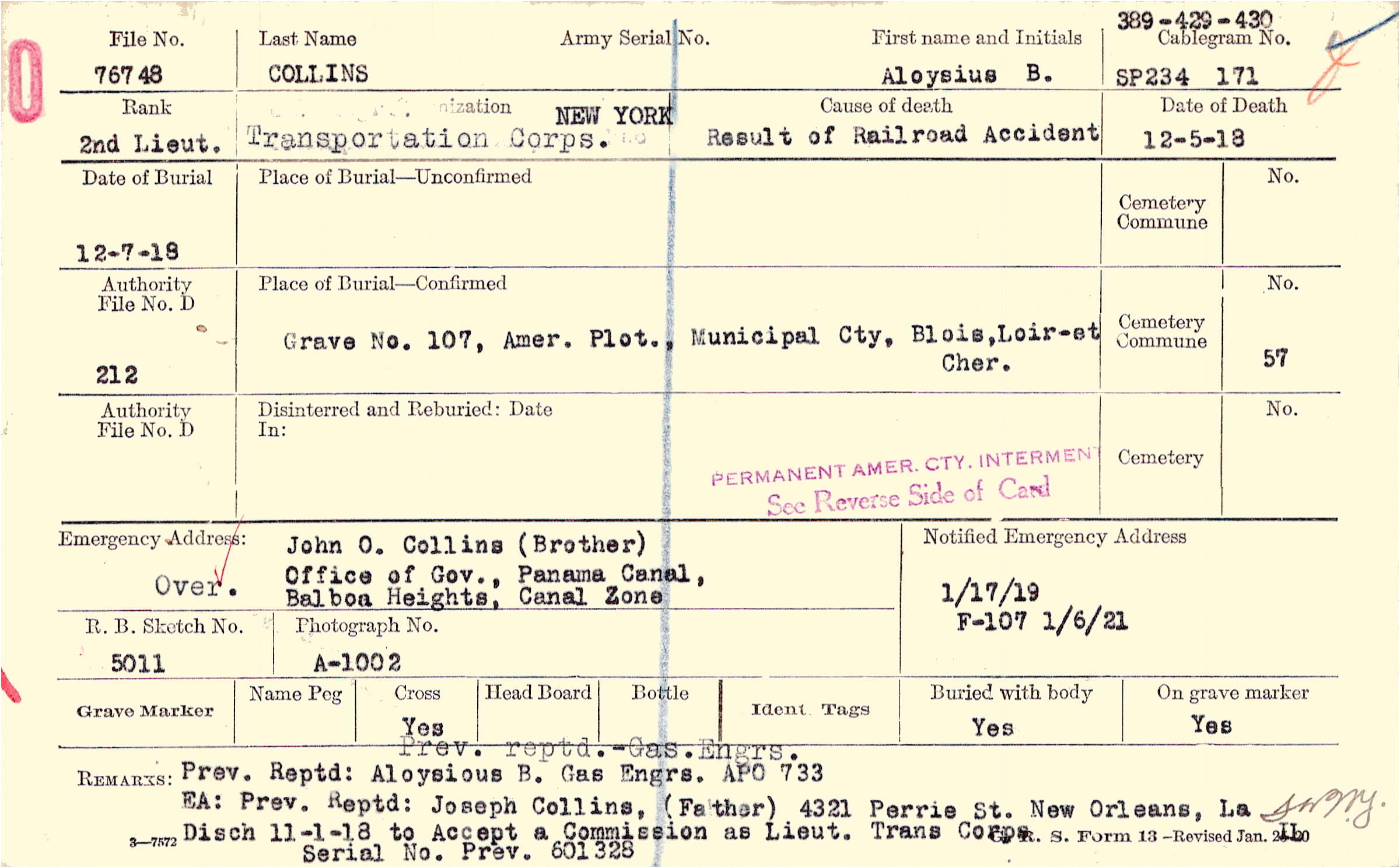 Prev. reptd. - Gas Engrs. Prev. Reptd: Aloysious B. Gas Engrs. APO 733 EA: Prev Reptd: Joseph Collins, (Father) 4321 Perrie St. New Orleans, La Disch 11-1-18 to Accept a Commission as Lieut. Trans Corps. Serial No. Prev. 601328
