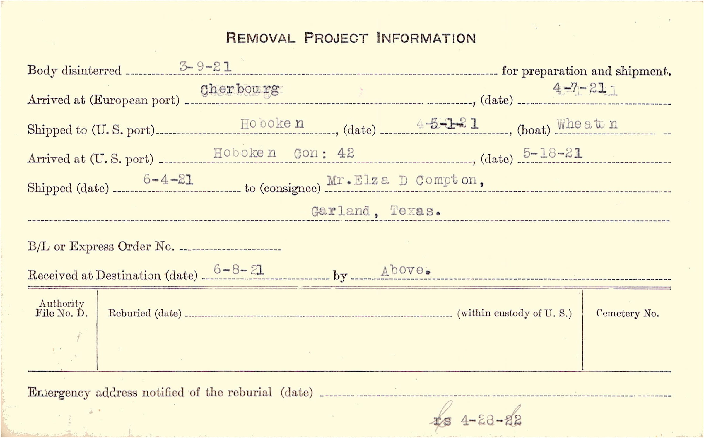 Body disinterred 3/9/1921 for preparation and shipment.