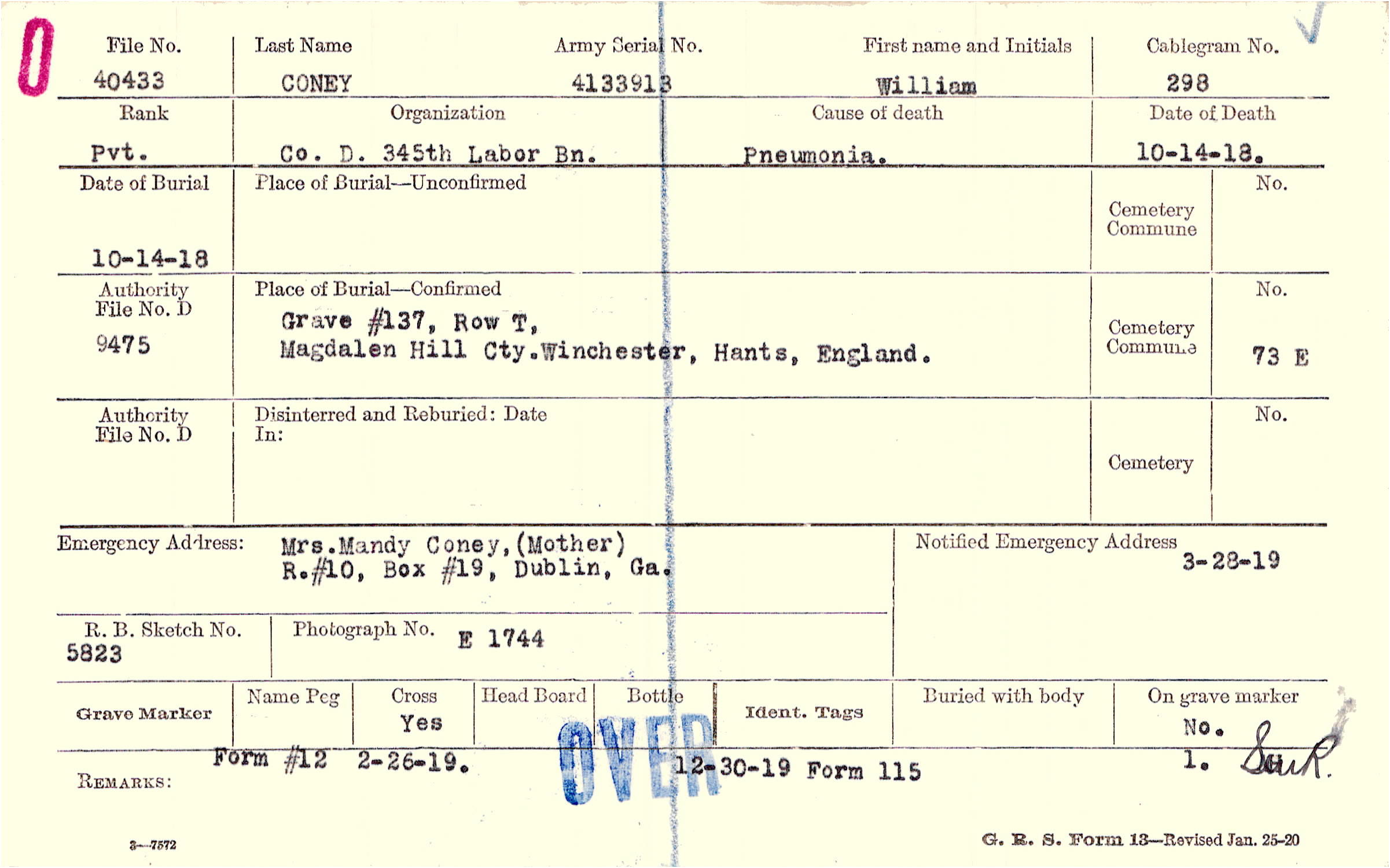 Mrs. Mandy Coney, (Mother), R.#10, Box #19, Dublin, Ga.