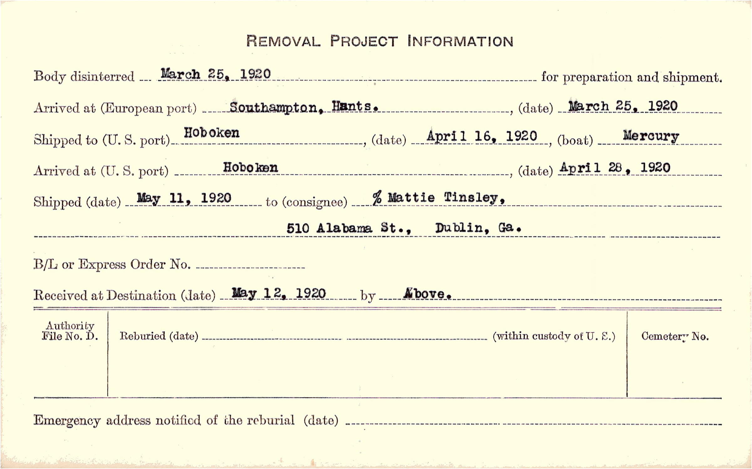Body disinterred 3/25/1920 for preparation and shipment.