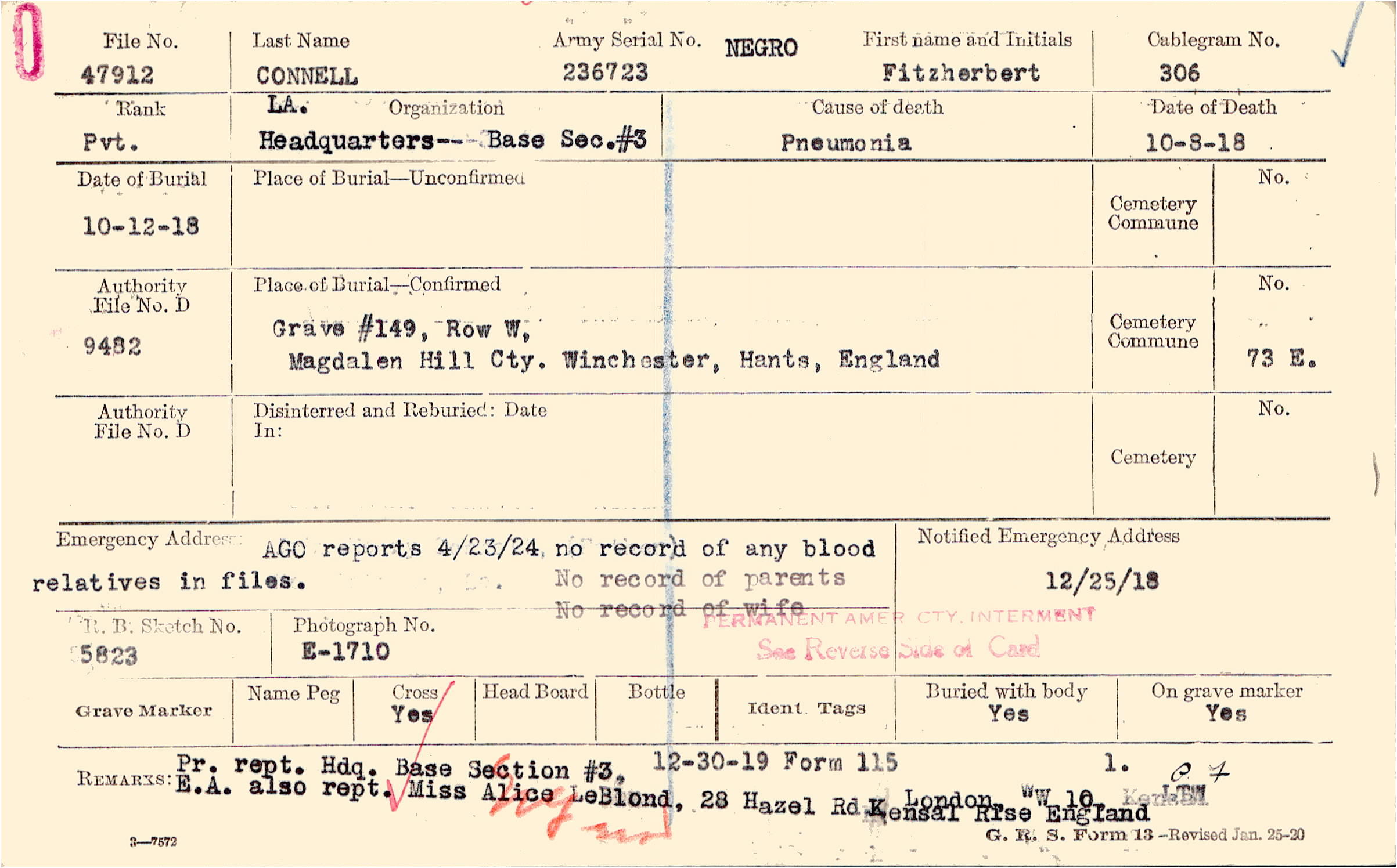 Pr. rept. Hdq. Base Section #3 E.A. also rept. Miss Alice LeBlond, 28 Hazel Rd. Kensal Rise London, WW 10, England, 12-30-19 Form 115