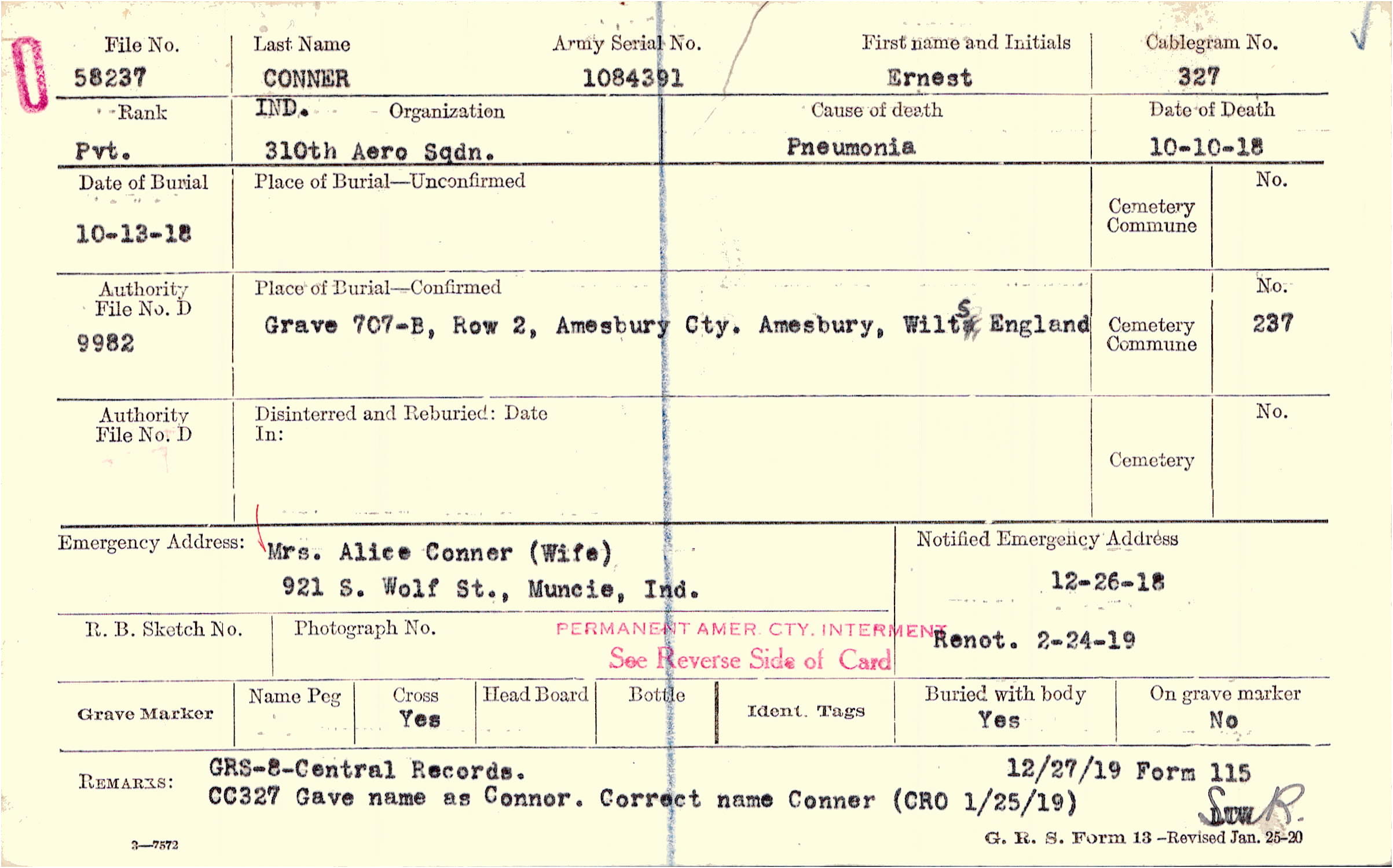 Mrs. Alice Conner (Wife), 921 S. Wolf St., Muncie, Ind.