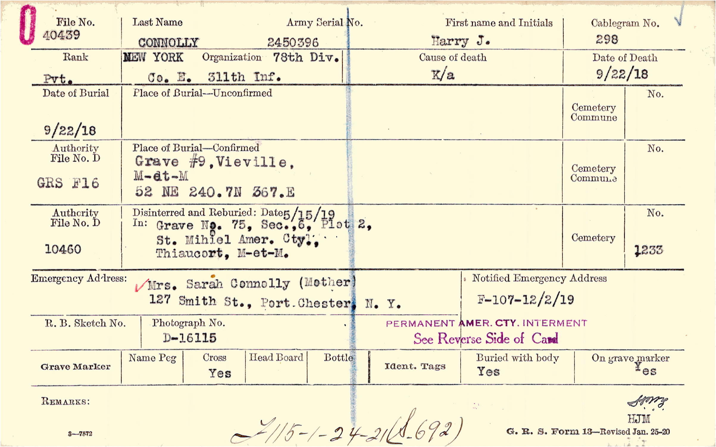 Mrs. Sarah Connolly (Mother), 127 Smith St., Port Chester, N. Y.