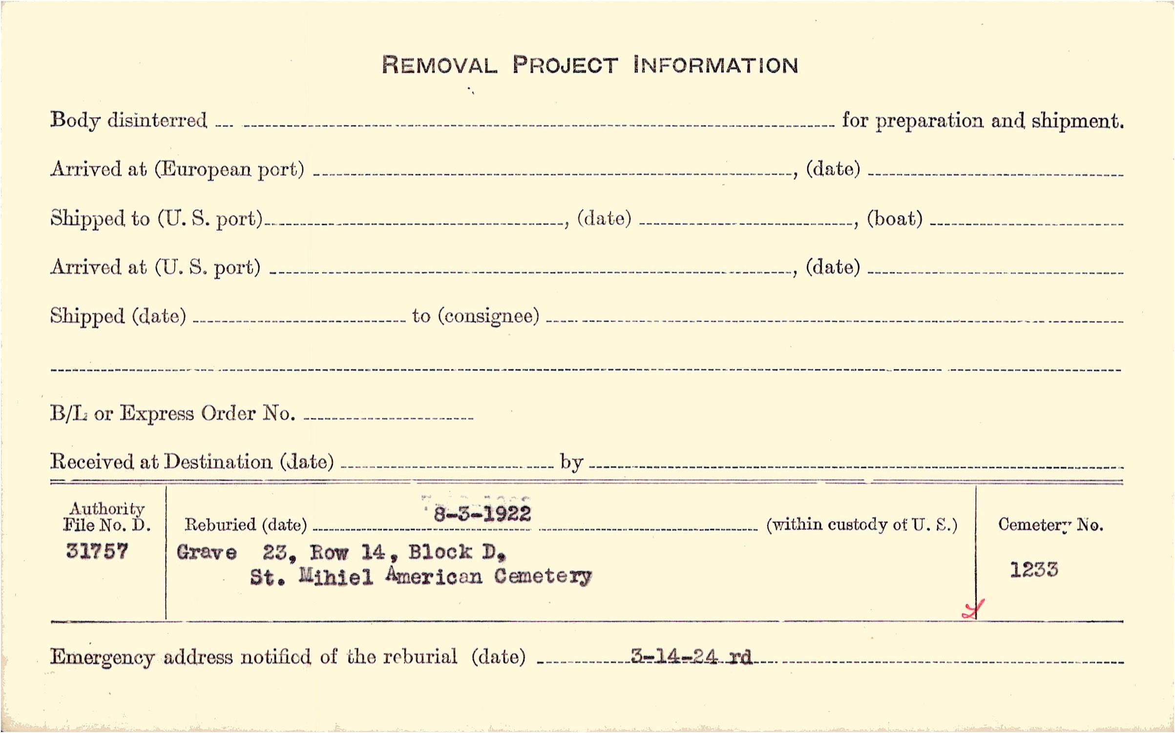 Grave 75, Section 6, Plot 2, St. Mihiel American Cemetery, Thiaucourt, Meurthe-et-Moselle